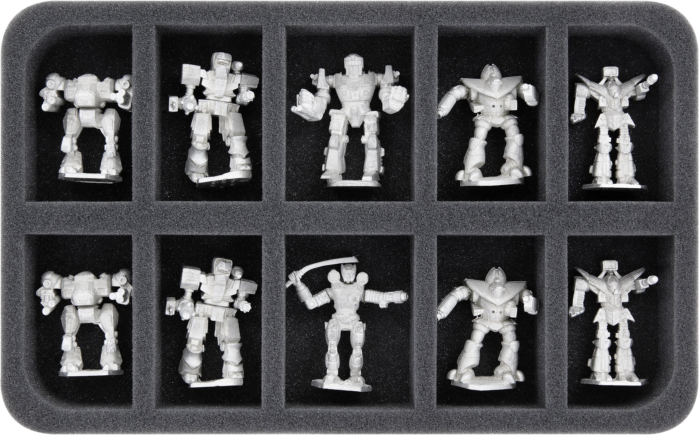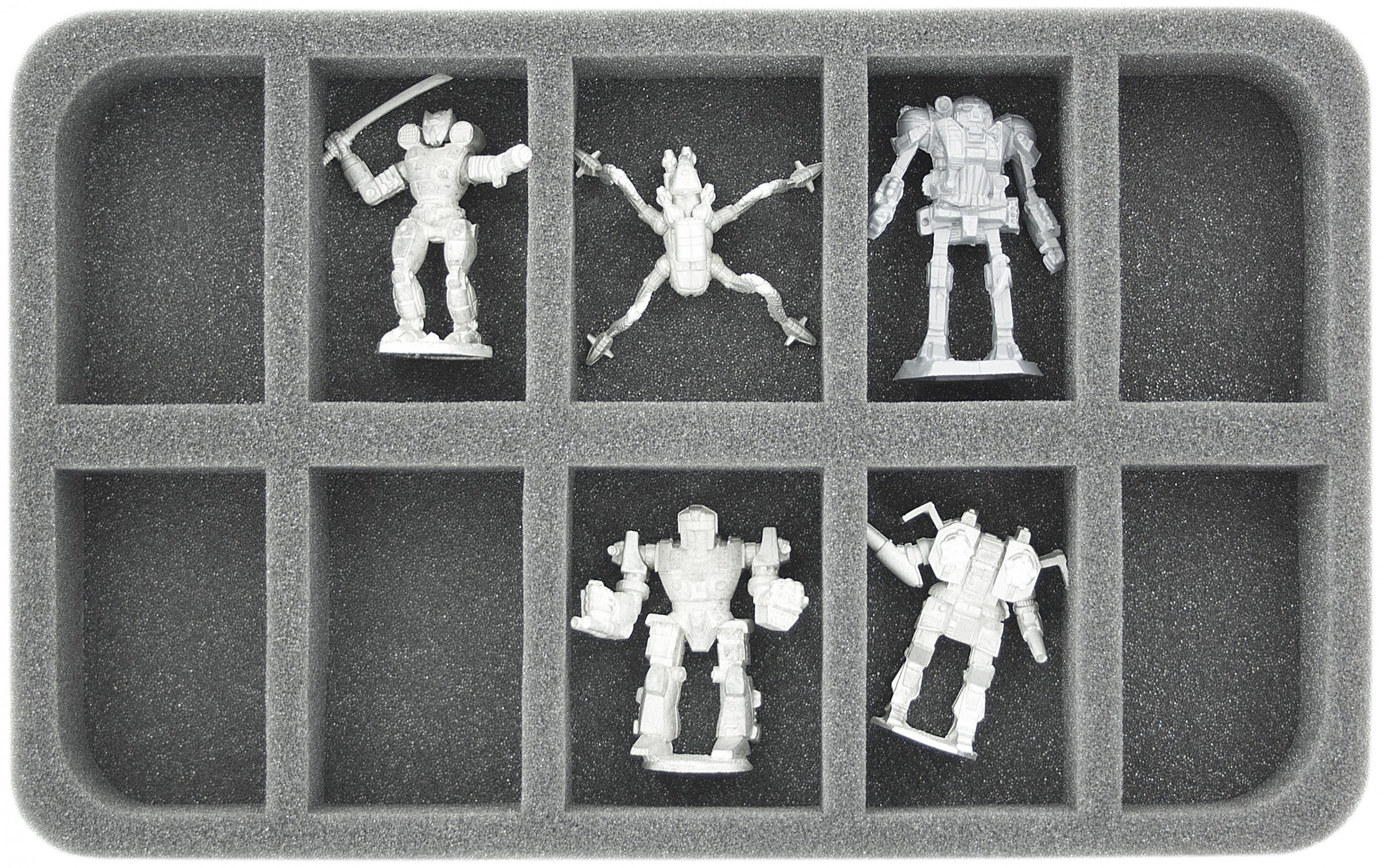 The foam trays with 10 compartments each are perfectly suitable for Mechs like the Atlas or miniatures of similar size.