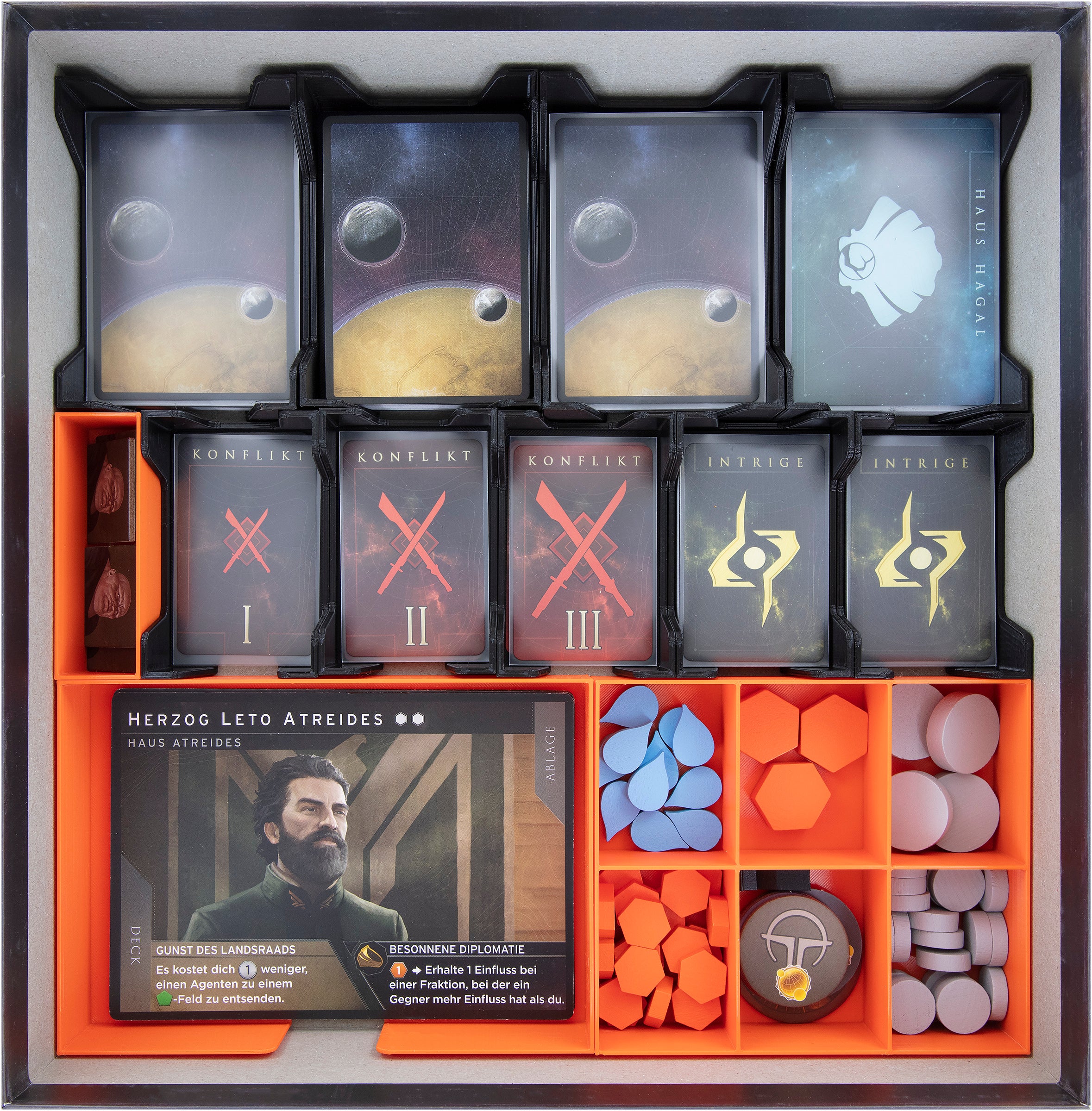 Various houses fight and scheme for supremacy on Dune. To strengthen your claim and support your house, the mentats of our design department have long racked their brains. The result is this plastic Feldherr Organizer, which keeps your core game box and the tabletop neat and tidy. Thus you have your tokens and cards always in view and the dagger in the back of your rival.