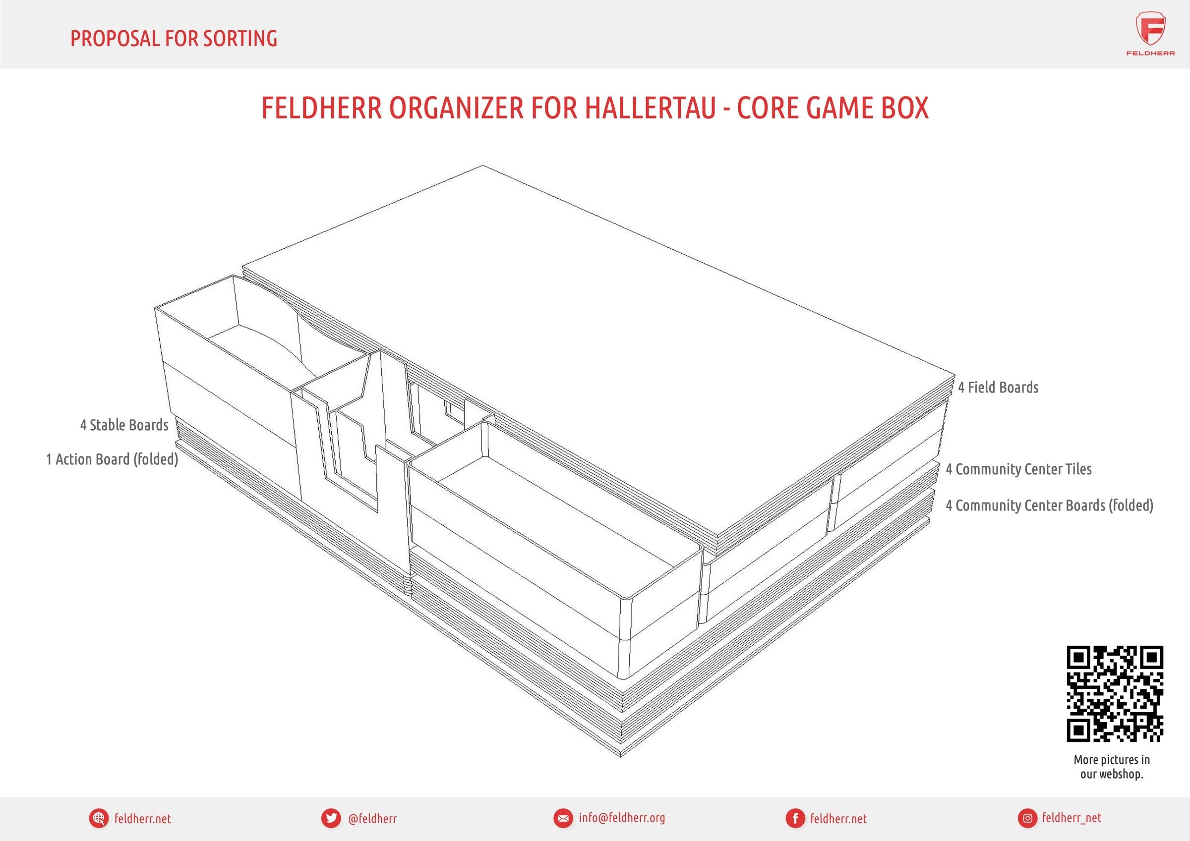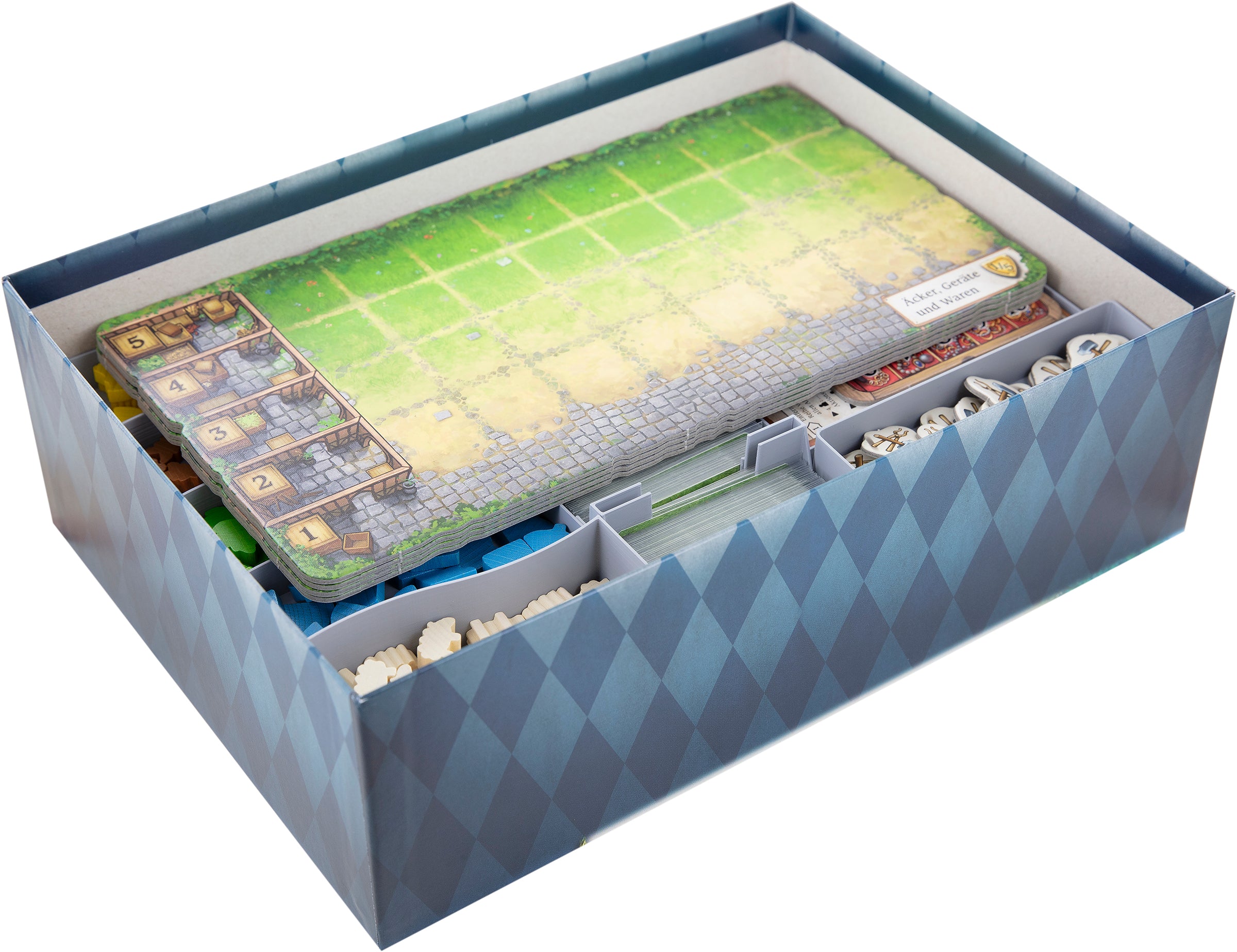 - The Organizer fits into the original board game box and offers space for the entire game material of the “Hallertau” core game.