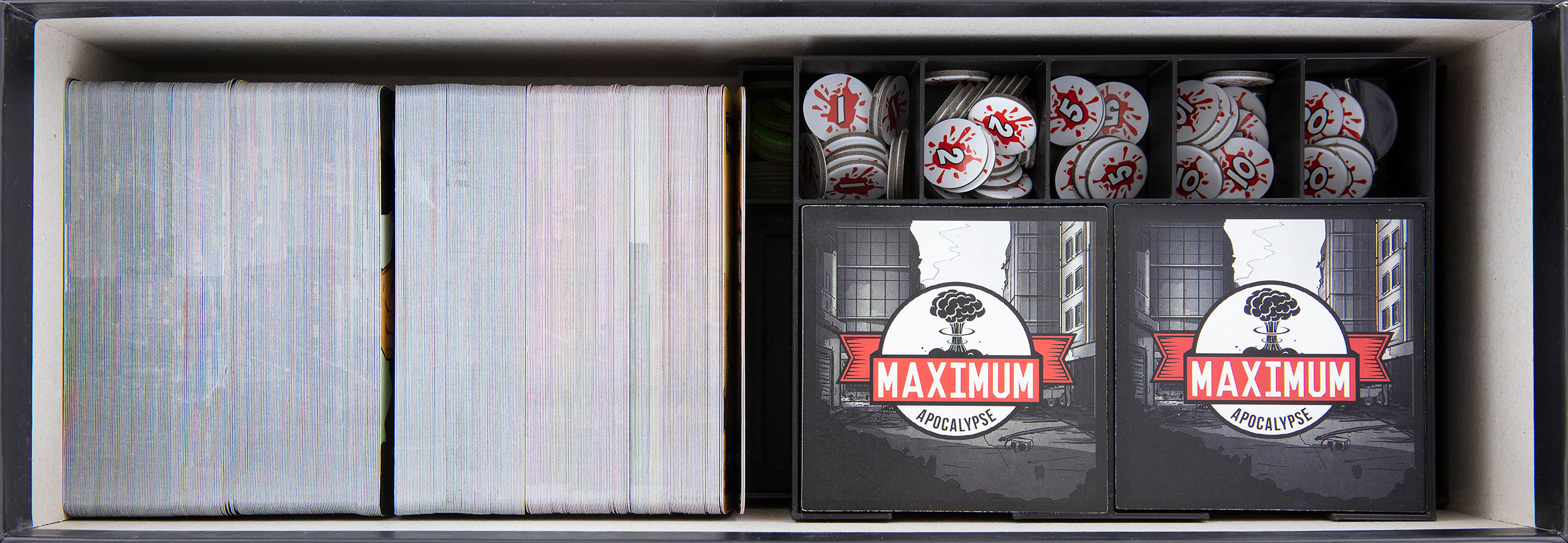 - The Organizer fits into the original board game box of the core game for “Maximum Apocalypse.”