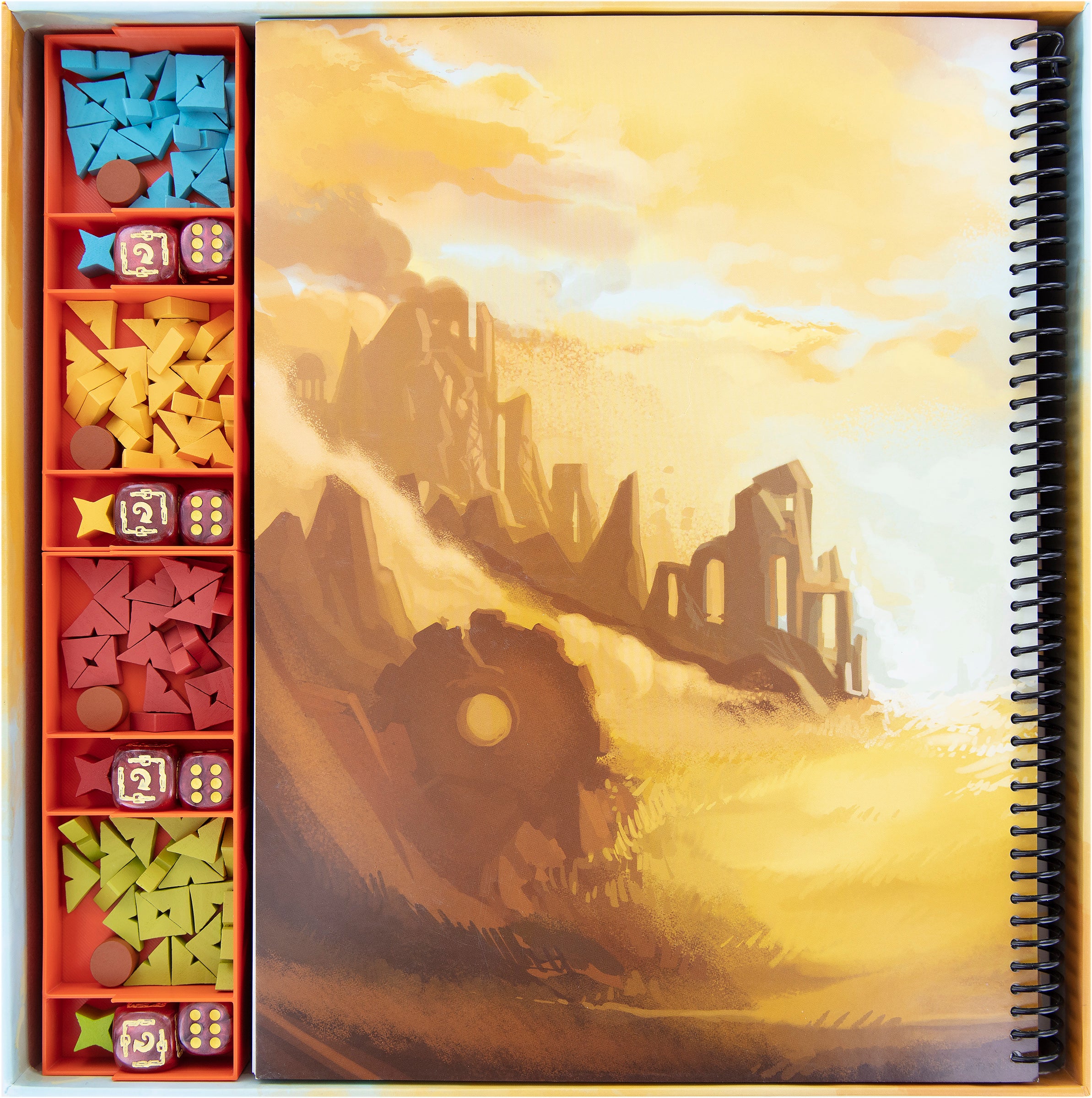 Town Board, Rulebook, New General Store Tile, Story Book, Atlas, New Mine/Mystic Hut Tile, cloth bag, the player trays, Player Board and Pencil are stored separately on the foam topper.