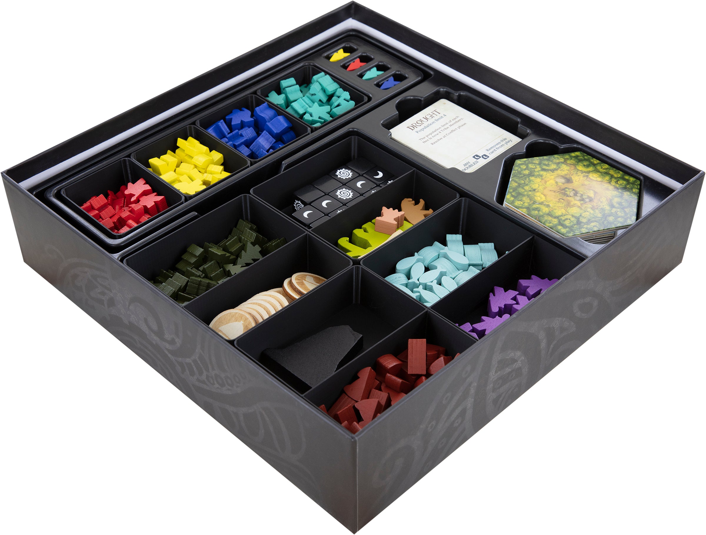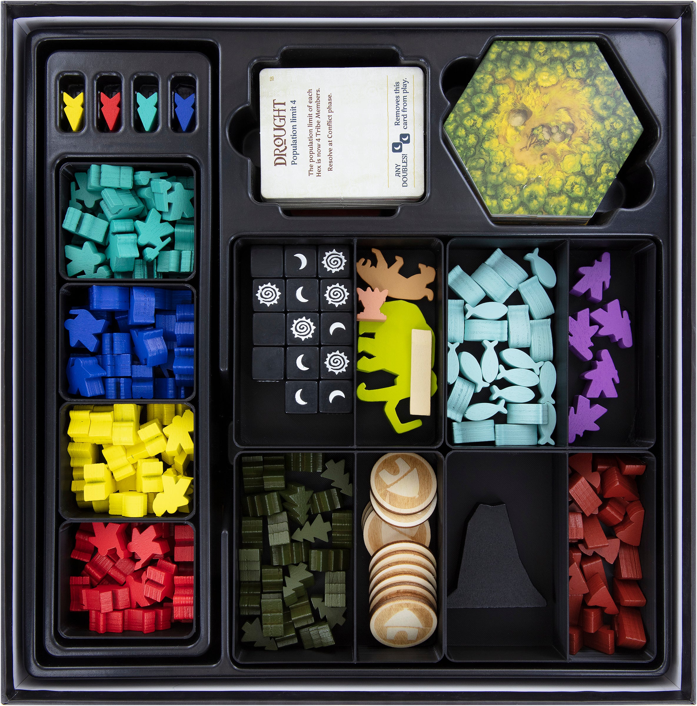 The 4 token holders, with the color sorted Tribe Member Meeples, have been designed to fit into the removable, rectangular plastic insert.