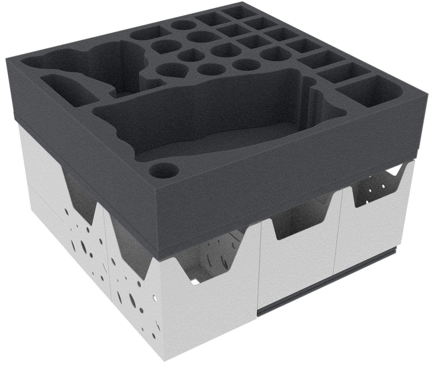 A thick foam mat improves stability and prevents the card holders from slipping. Three thin foam mats are used as height compensation. The foam topper is placed on top of the foam tray. It ensures that none of your models will bump against the lid of the board game box during transport.