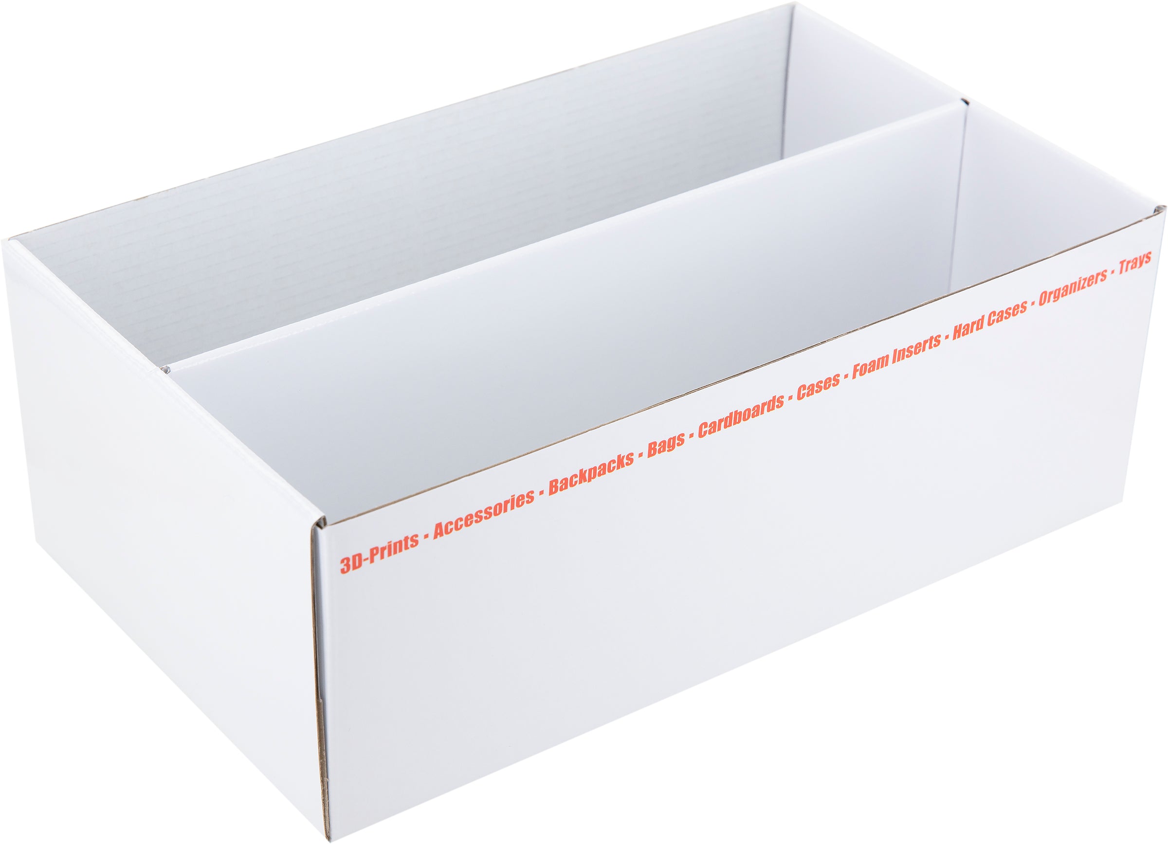 A partition in the middle of the box divides it into two equal-sized compartments. This allows the cards to be lined up neatly without mixing during transport.