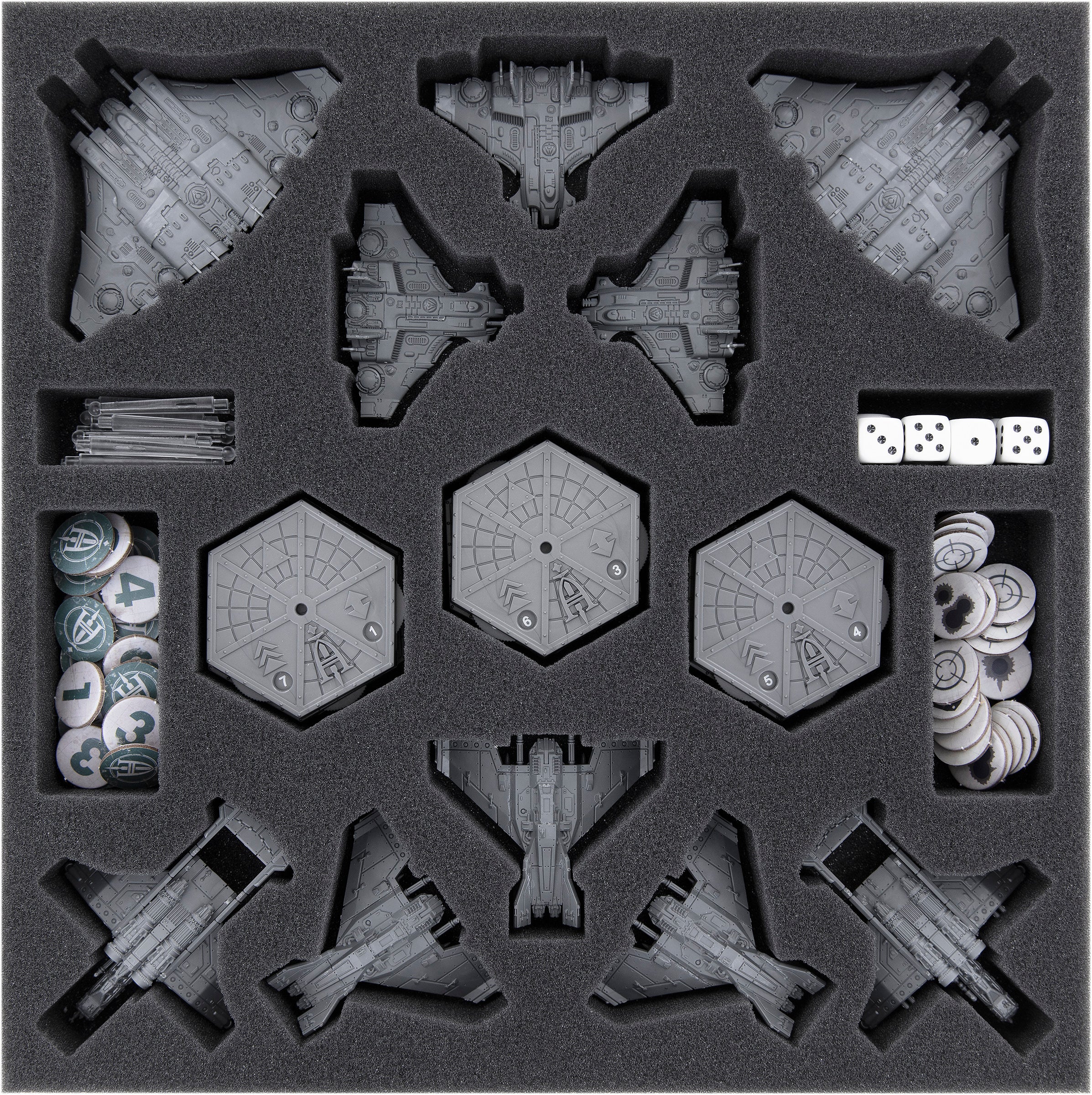 - Provides space for all 10 miniatures of the T'au Air Caste, the Astra Militarum and the Imperial Navy, as well as for all accessories from the box.