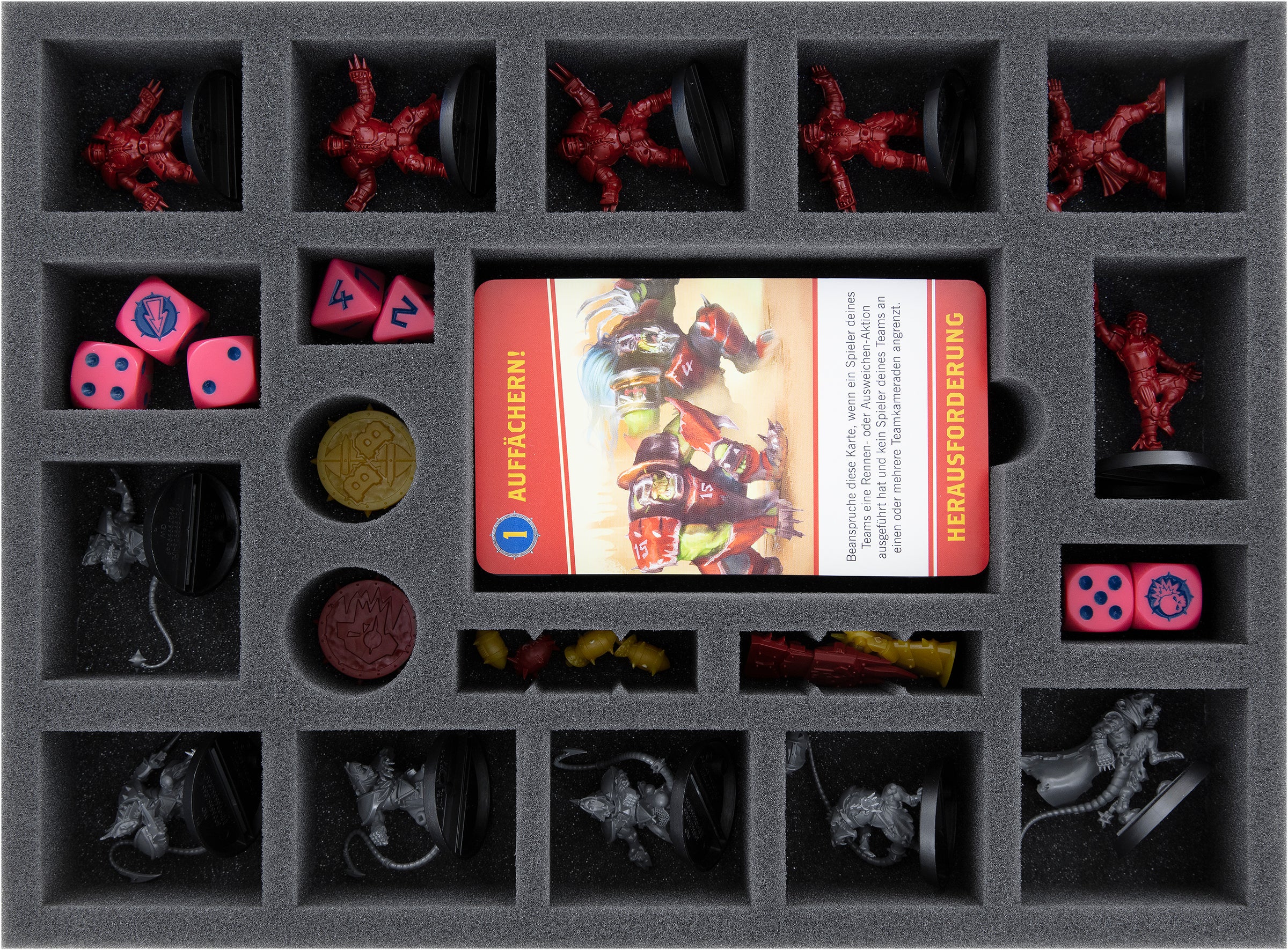 - Creates order: The foam tray provides space for all miniatures (incl. bases), dice, cards, balls, coins, and score markers - so you have everything arranged and always in view.