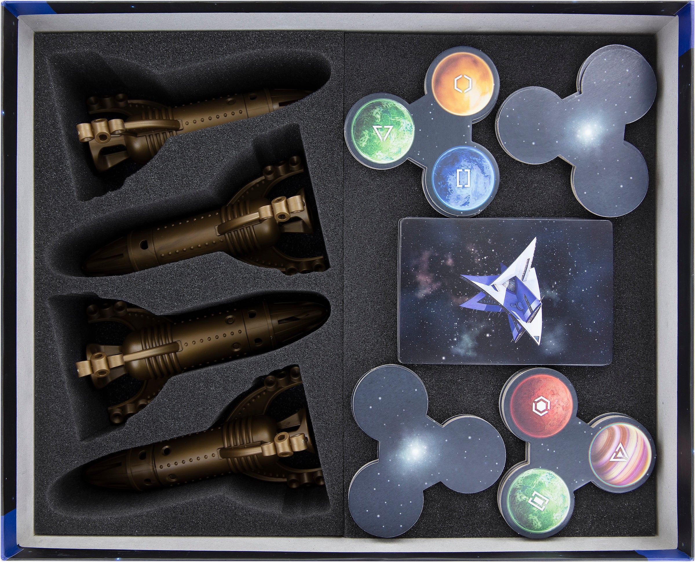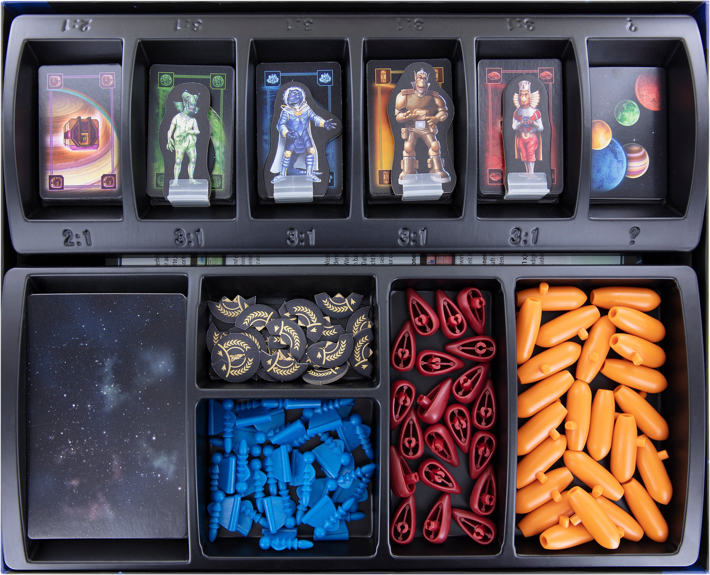 Place the Mothership insert and the player trays inside the box. On top of the player trays, you place the fitting foam mat. Put the Sectors and the Friendship Cards on the foam mat. Then cover everything with the supplied foam topper. This way nothing slips. Your miniatures are well protected from all sides.