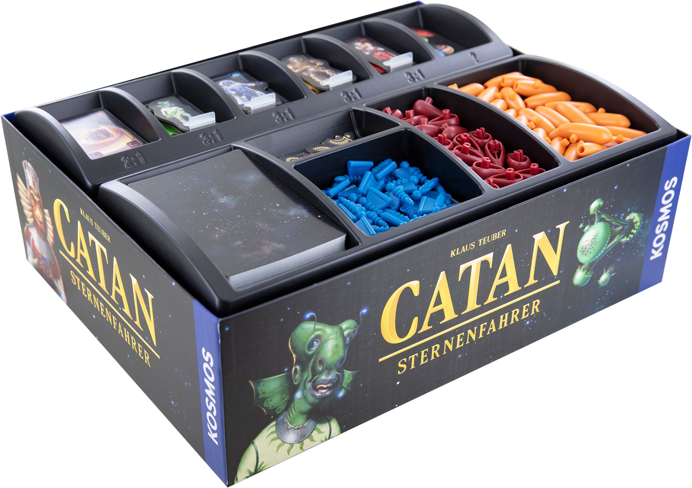 - The set fits into the original board game box of Catan: Starfarers created by Catan Studio.
