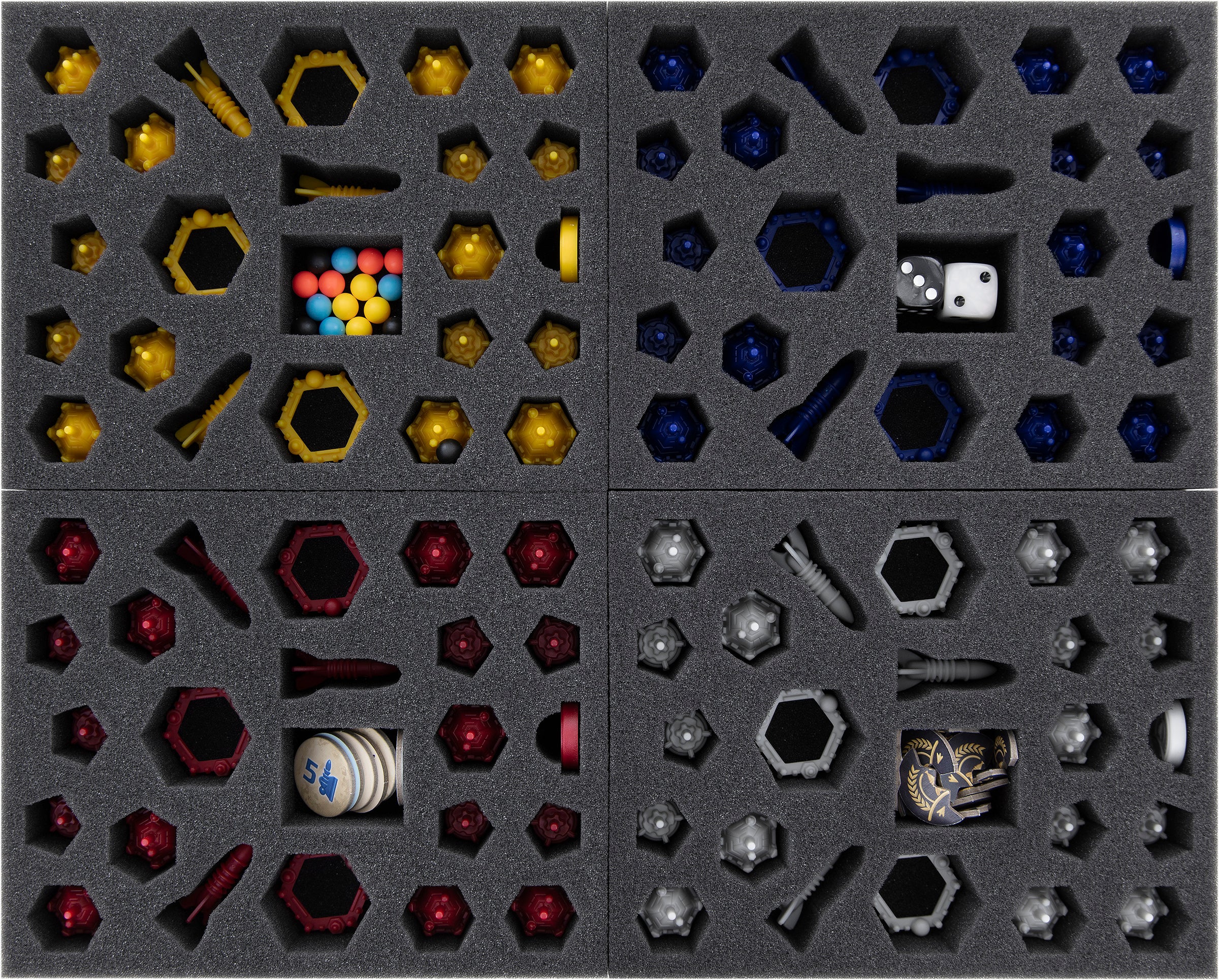 Each of the four identical foam trays has enough compartments to sort all 92 figures and the Victory Point Markers by color. The miniature-exact cut helps you to sort them. In the rectangular compartment, you can store the colored Balls, Dice, Special Token, and Discs. The soft, fine-pored foam protects the detailed miniatures reliably from damage even during transport. Also, the precisely fitting cut prevents them from slipping around or bumping into each other. When you have painted your miniatures, you can be sure that the soft foam protects the colors from abrasion and annoying scratches.