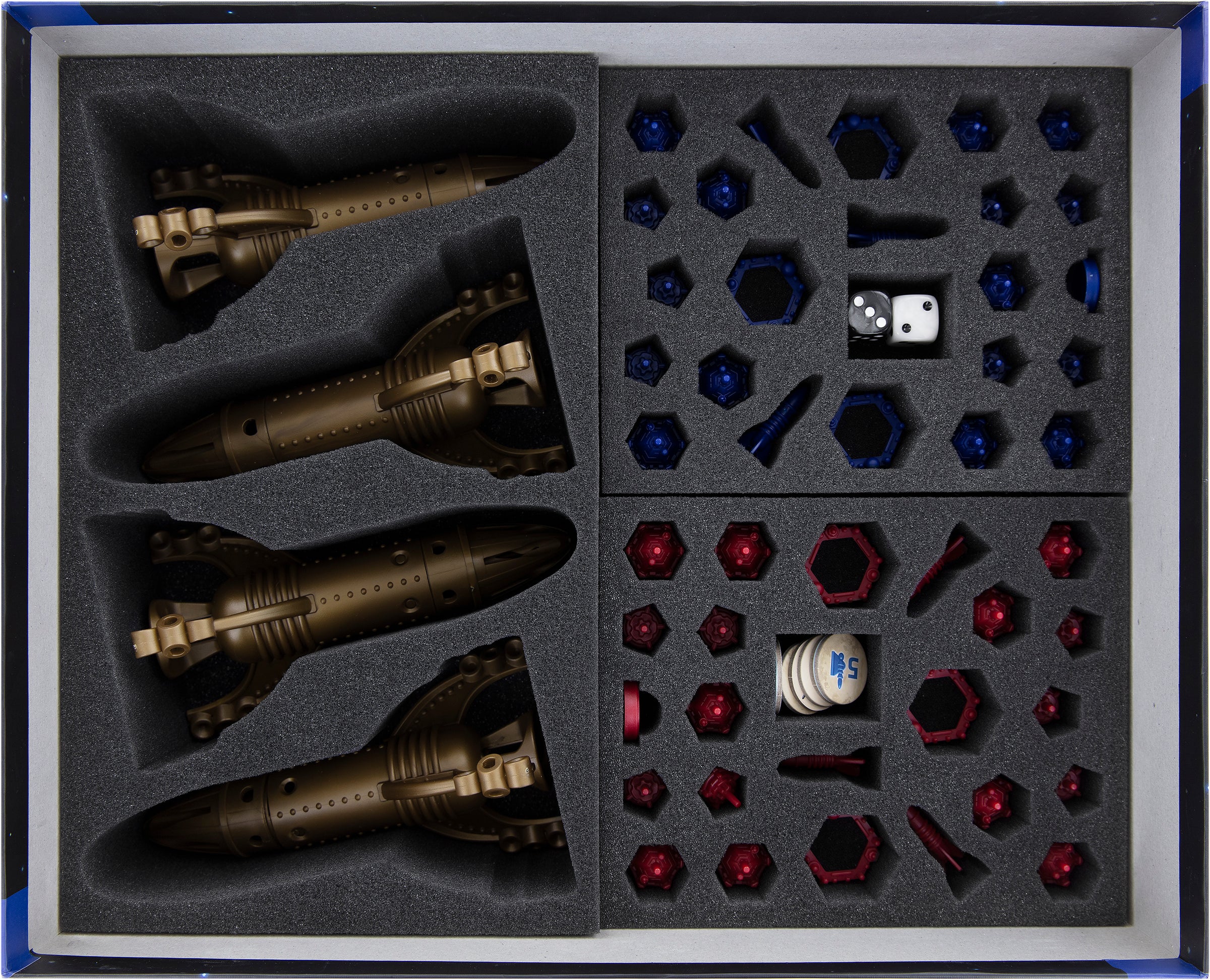 The four Motherships find a suitable hangar in the fifth insert. Four dimensionally accurate compartments ensure that the missiles remain firmly and securely in their storage location.