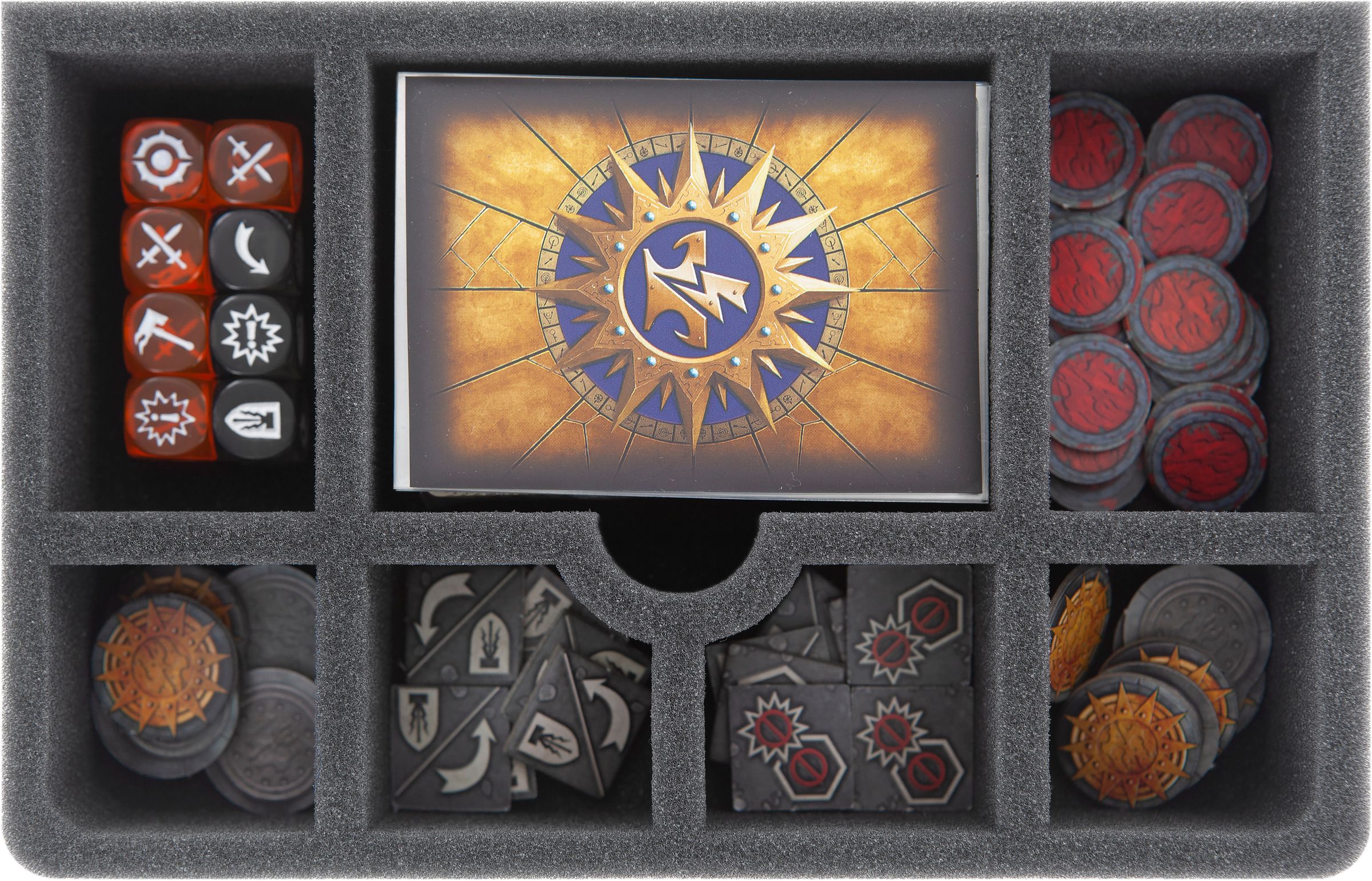 - 4 GWA-Size foam trays with 7 compartments each for game material like cards, token and dice (CQMEID050BO).