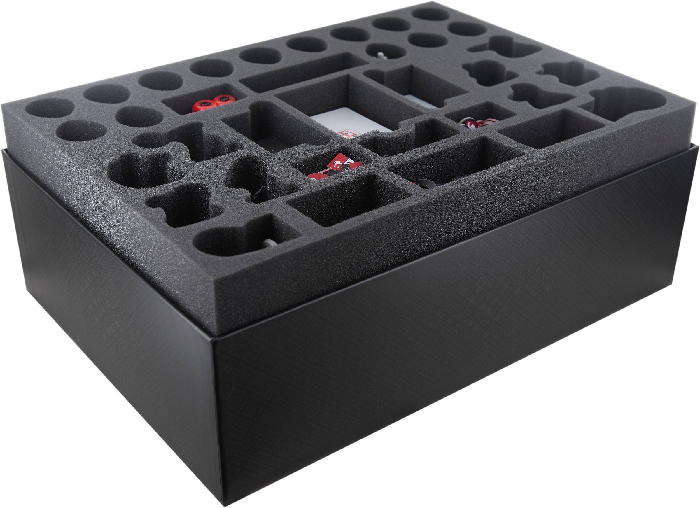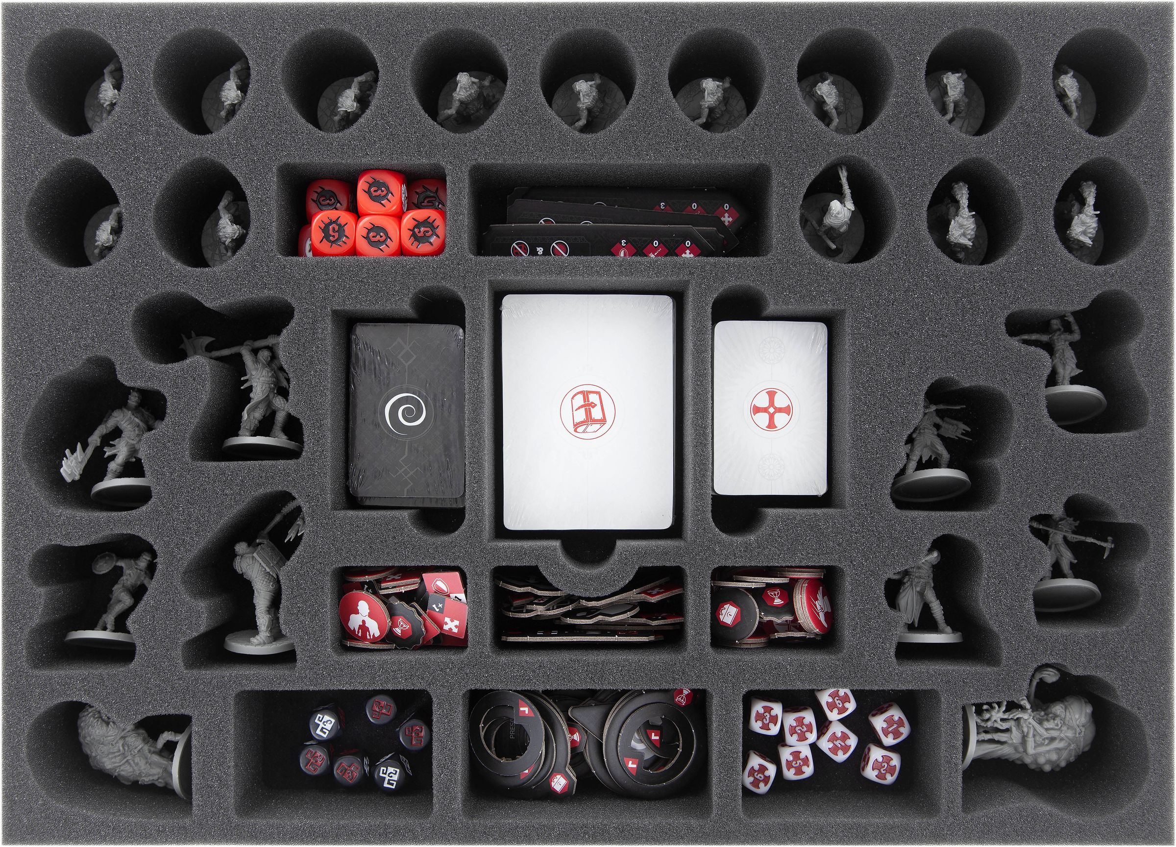 - 1 foam tray with 34 compartments for miniatures, (sleeved) cards, token and dice (DOMEQK050BO)