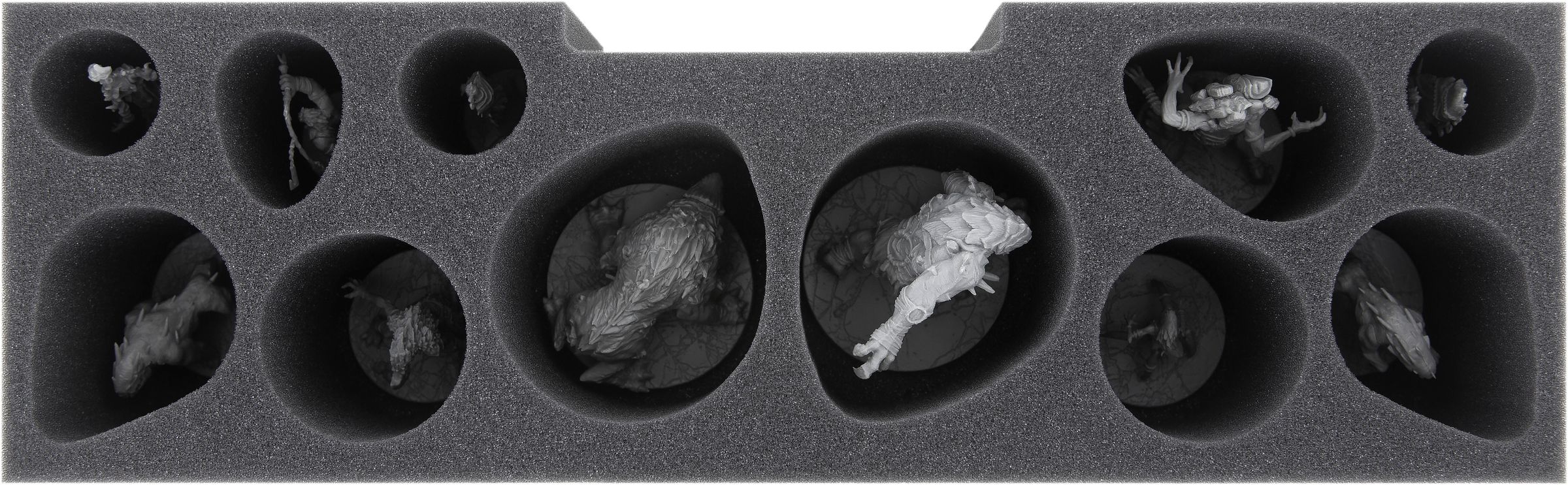 The first foam tray has 11 custom compartments for medium-sized and large miniatures like e. g. The Scourge and Cerberus. This tray fits exactly into the plastic-insert of the original game box.