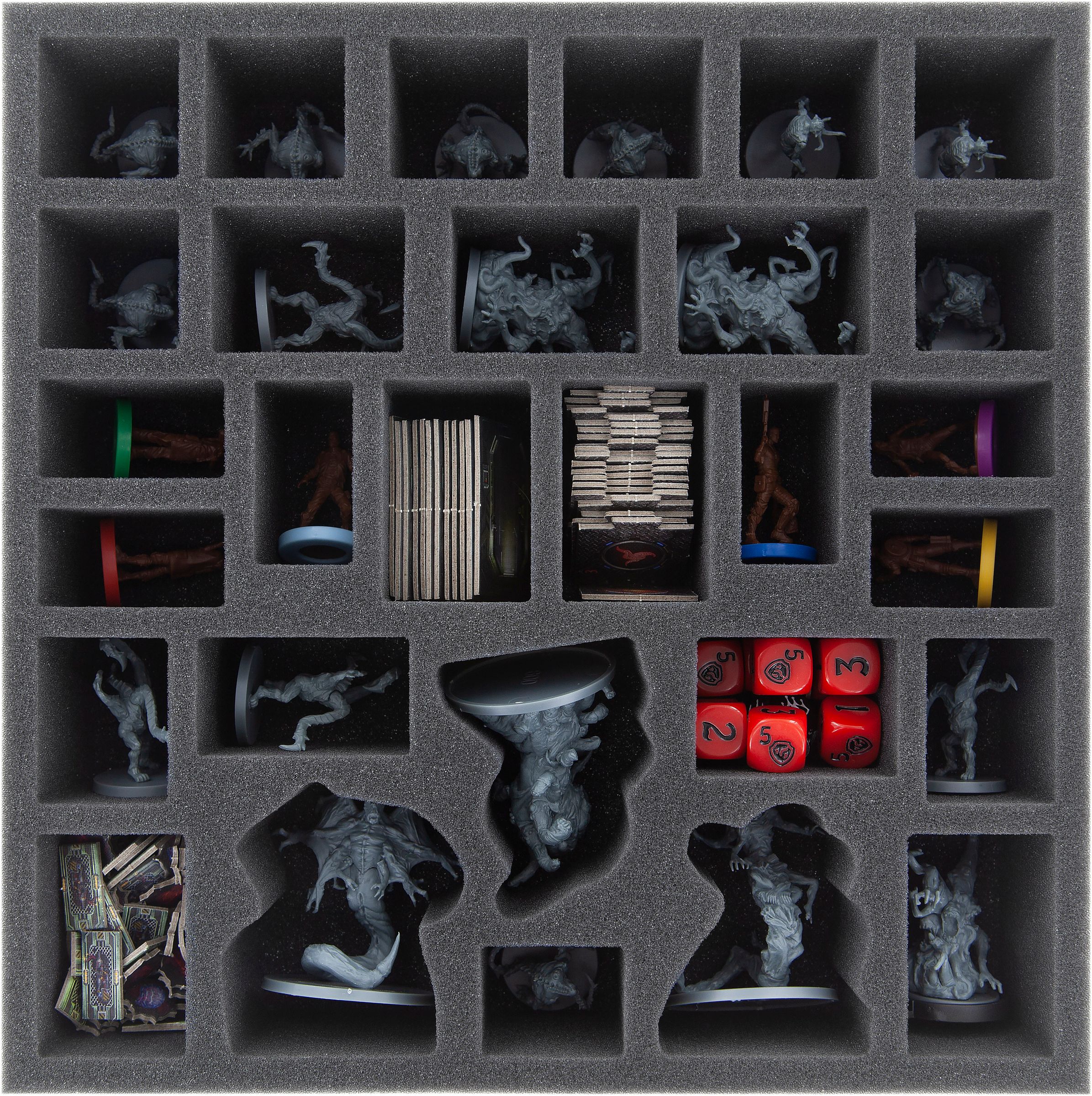 - Suitable for all 66 miniatures and all tokens, markers, Spawn Cards, Room Cards, Activation Cards, Consciousness Cards, Madness Cards, Scenario Cards, Drowning Dials, Locked Hatch Standees and Plastic Stands, dice and Devouring Track Blocks.