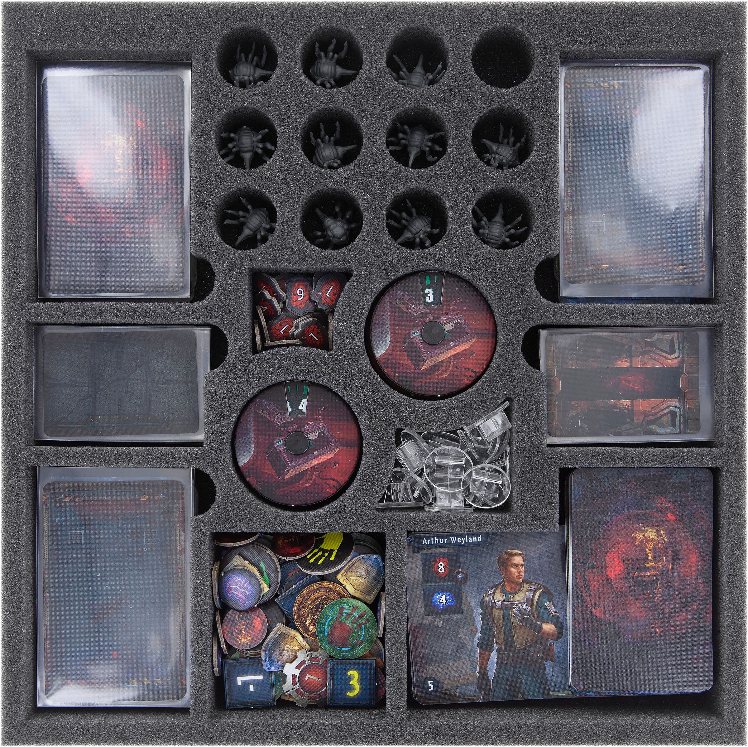 To make sure you don't descend into madness when trying to sort your „Deep Madness“ game material, Feldherr presents you a foam set which allows you to properly organize and reliably protect miniatures, cards and the small game material.