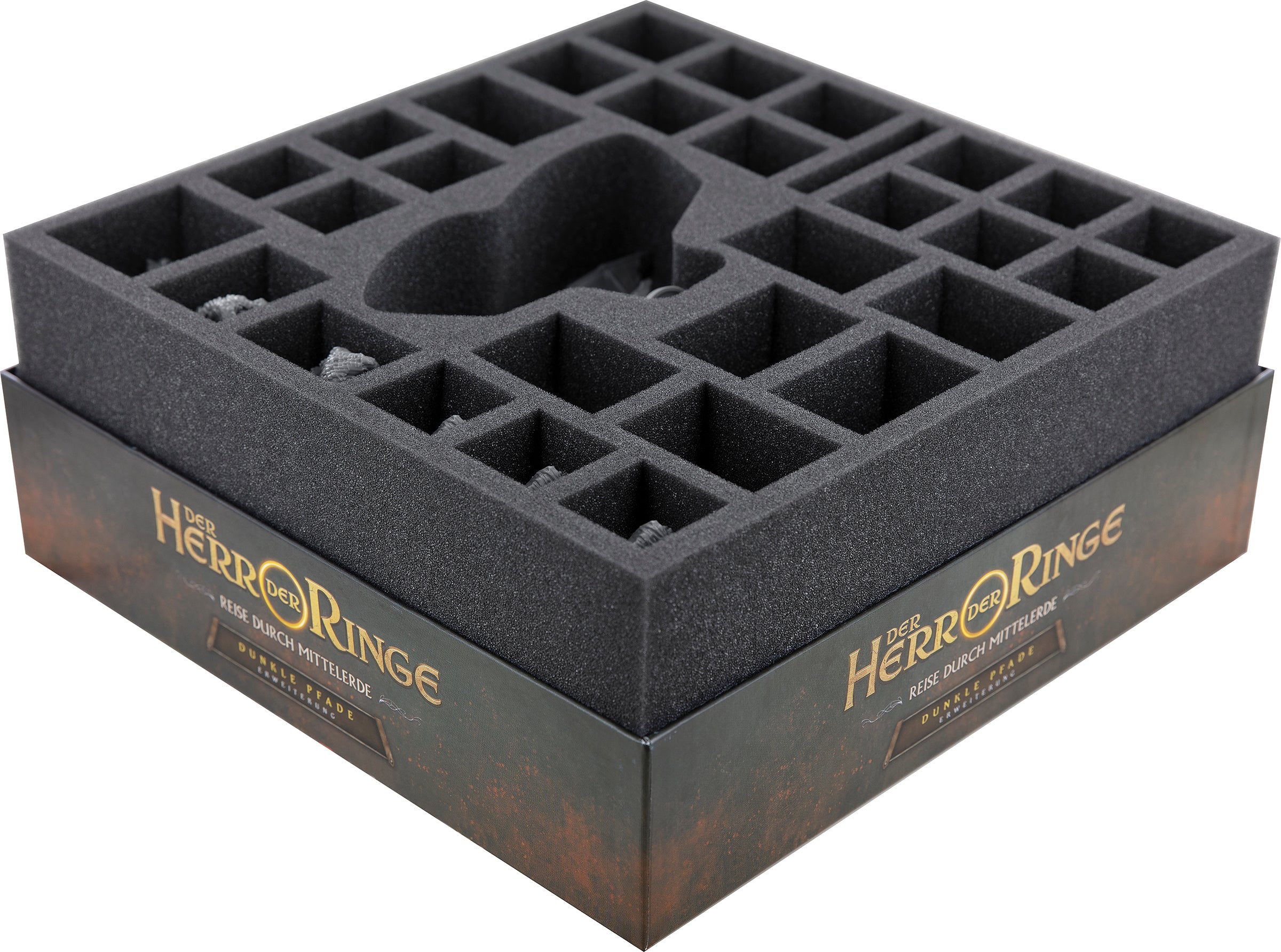 In the upper foam tray you can place the miniatures. Arwen, Balin, Dis, Eleanor and Gandalf, as well as the Balrog and the other 24 figures of your enemies, will be assigned their own miniature-precisely cut compartments. Thanks to the precise fit the detailed miniatures stay safely in place even when the box is transported.