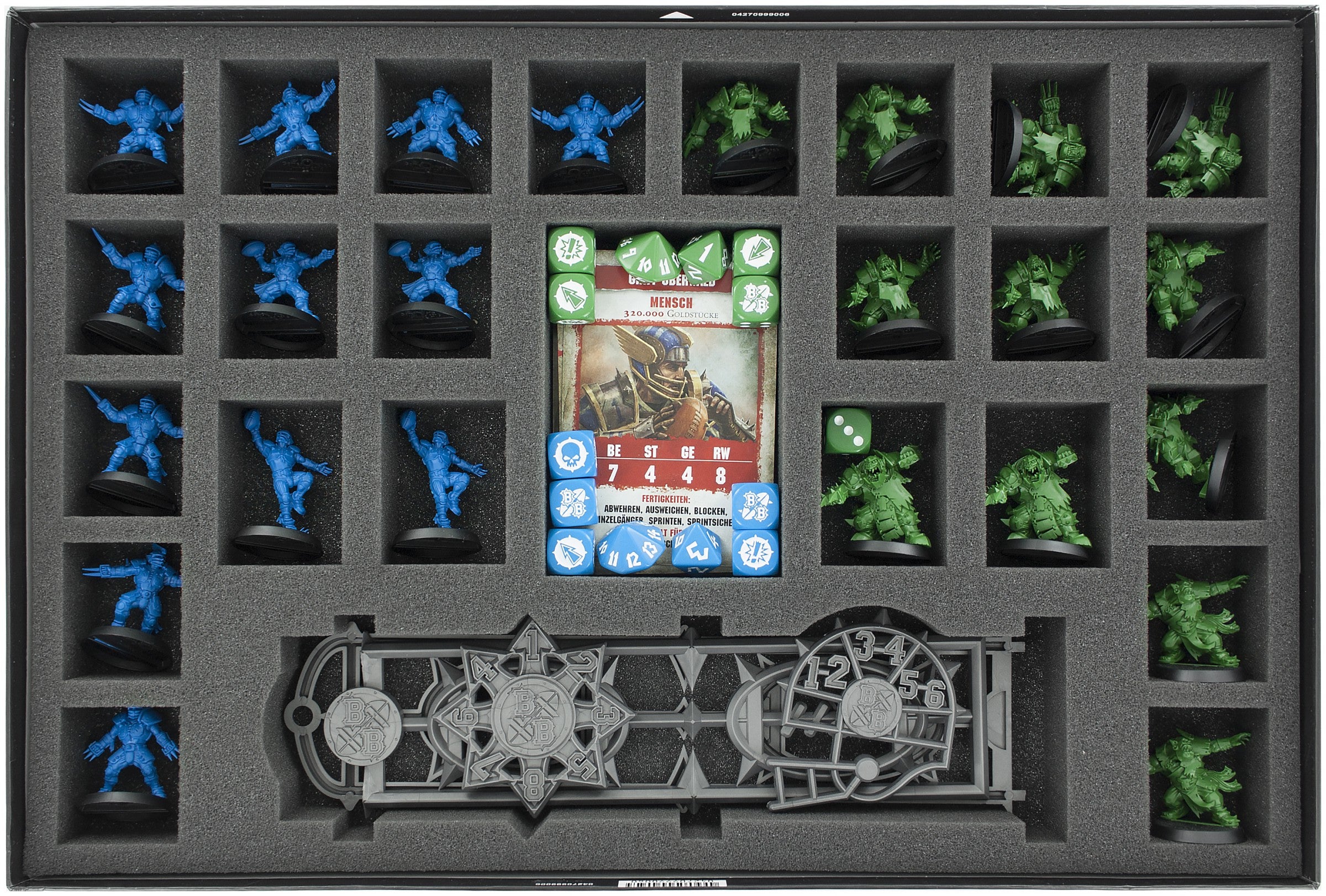 Especially for Blood Bowl 2016 board game box cut foam tray. The foam tray with 26 cut outs large enough for all miniatures from the game and fits perfectly into the original board game box. There is an additional 4 mm foam topper to protect the Blood Bowl 2016 figures.