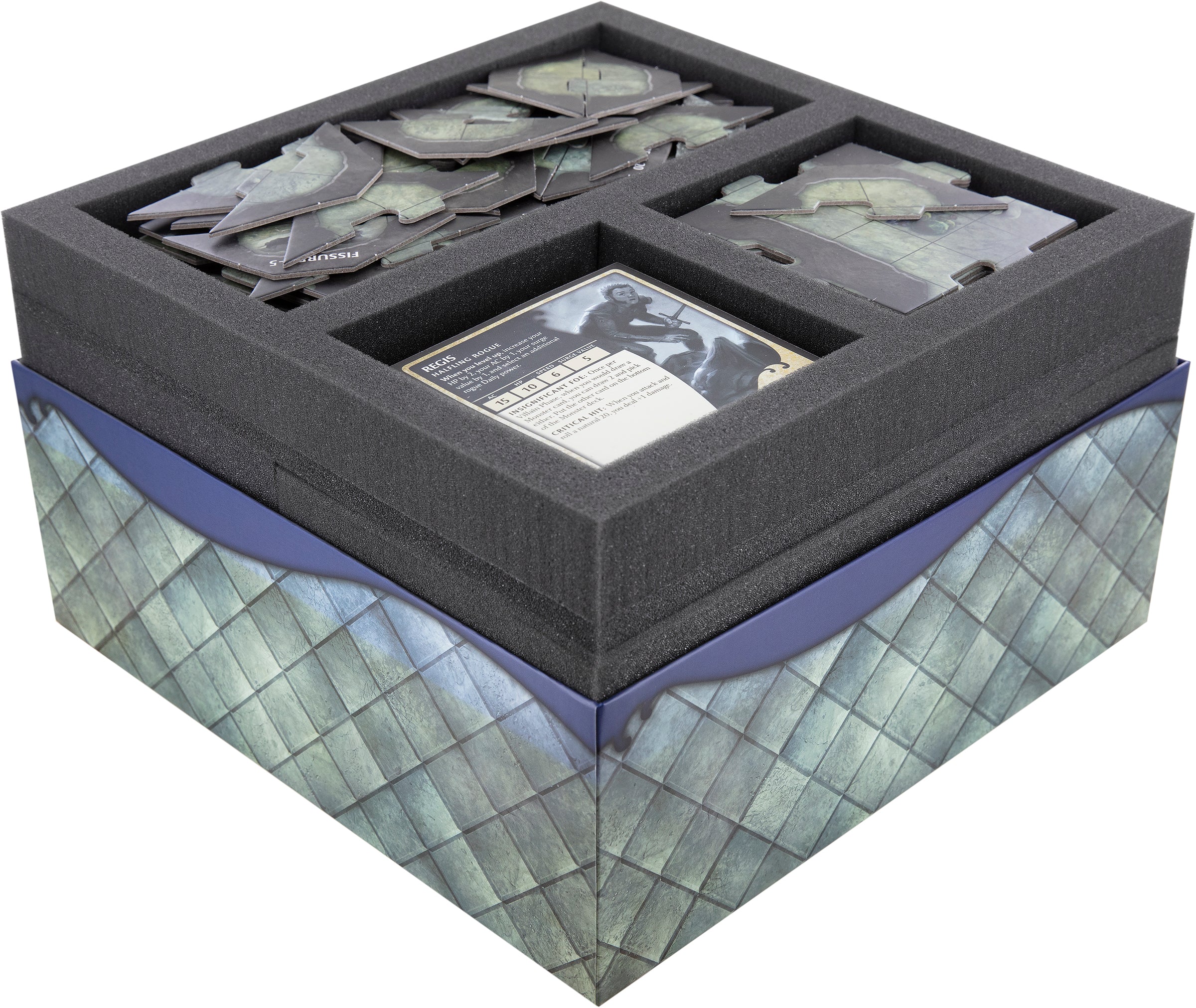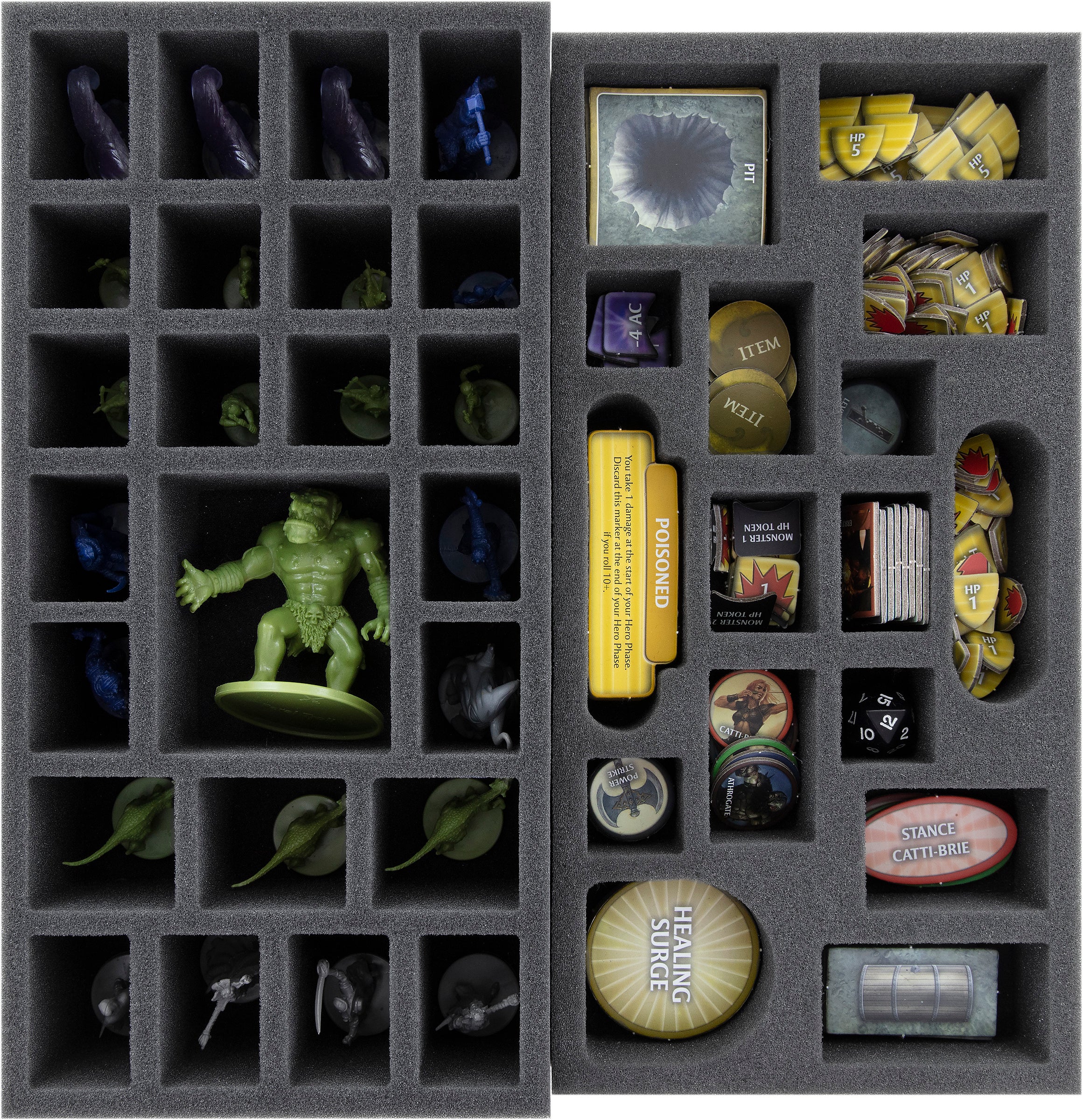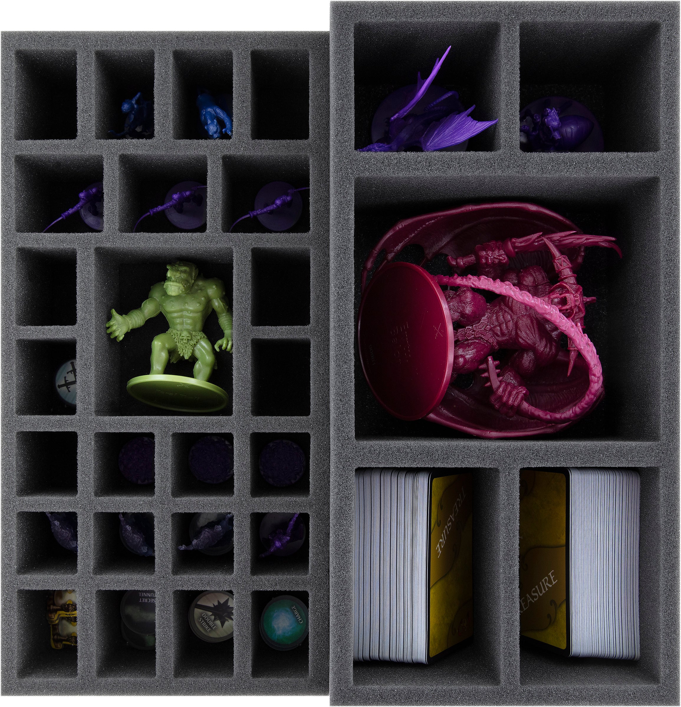 - 5 foam inserts provide space for the 40 plastic miniatures, 200 cards, 70 tiles, and the game materials from the core game.
