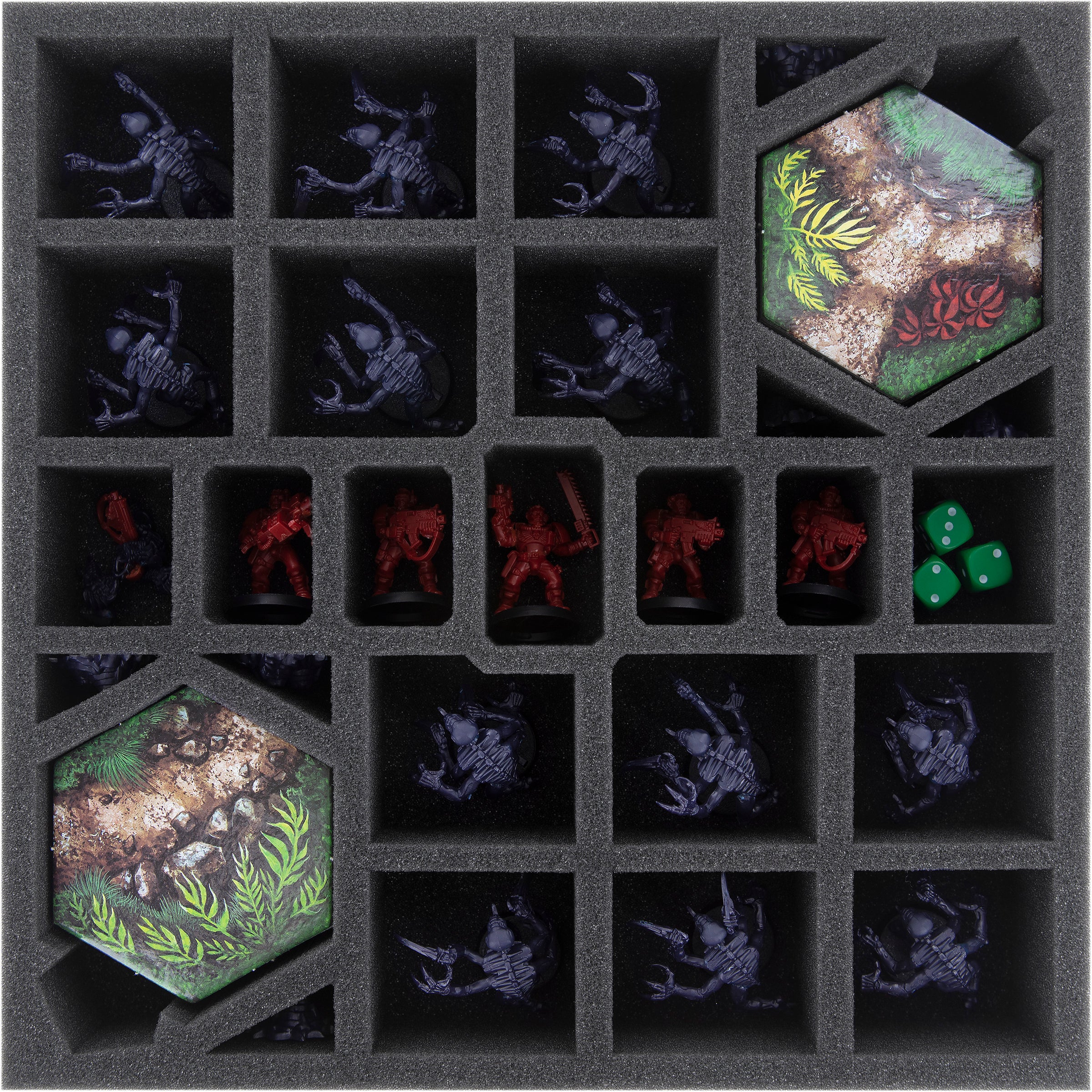 For the miniatures you have 23 compartments at your disposal. The Space Marine Scouts line up in the middle of the foam tray, surrounded, just like in the jungle, by the Genestealer models. The six Infestation markers of the Xenos are stored in the small triangular compartments next to the map tiles.