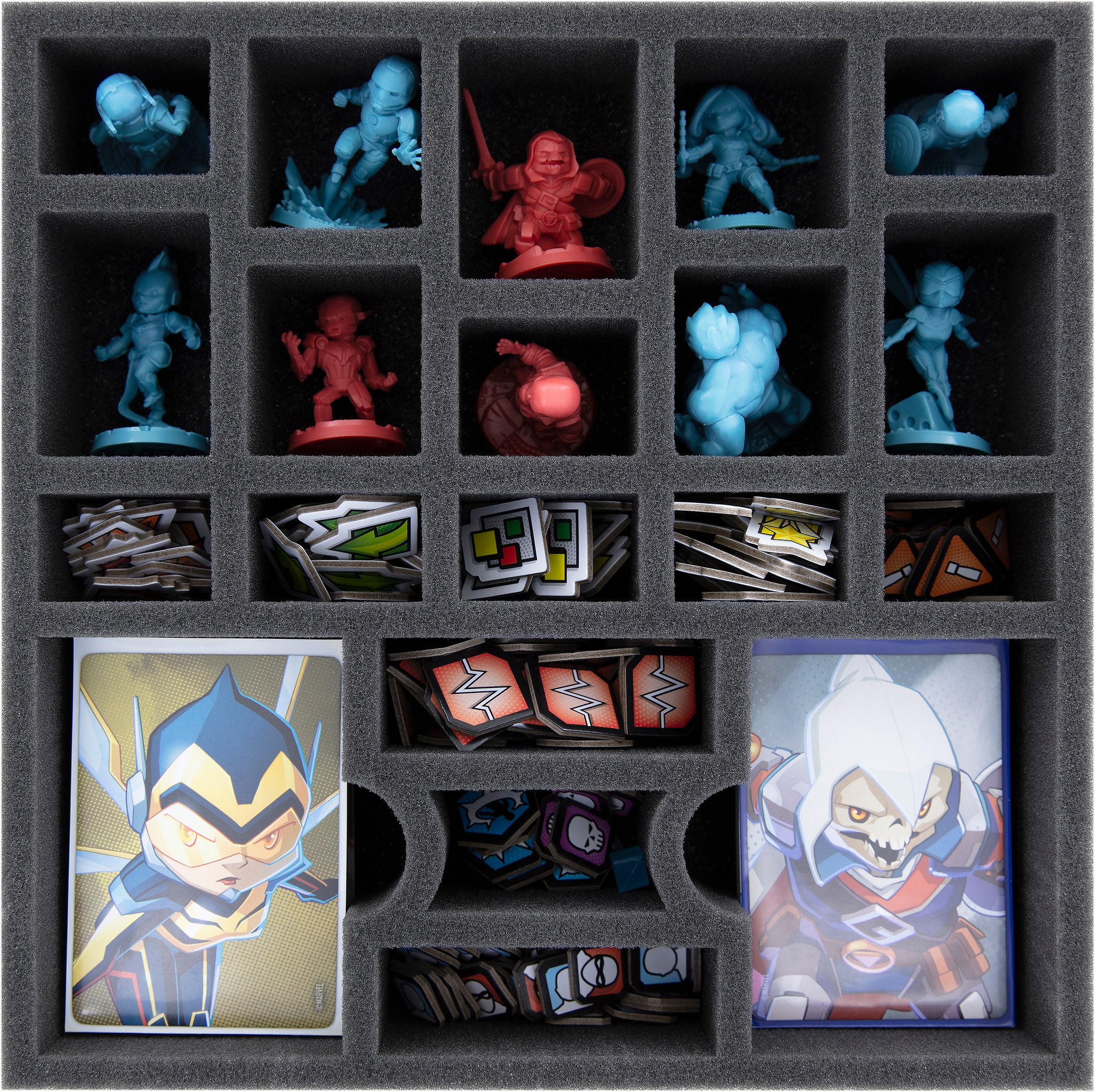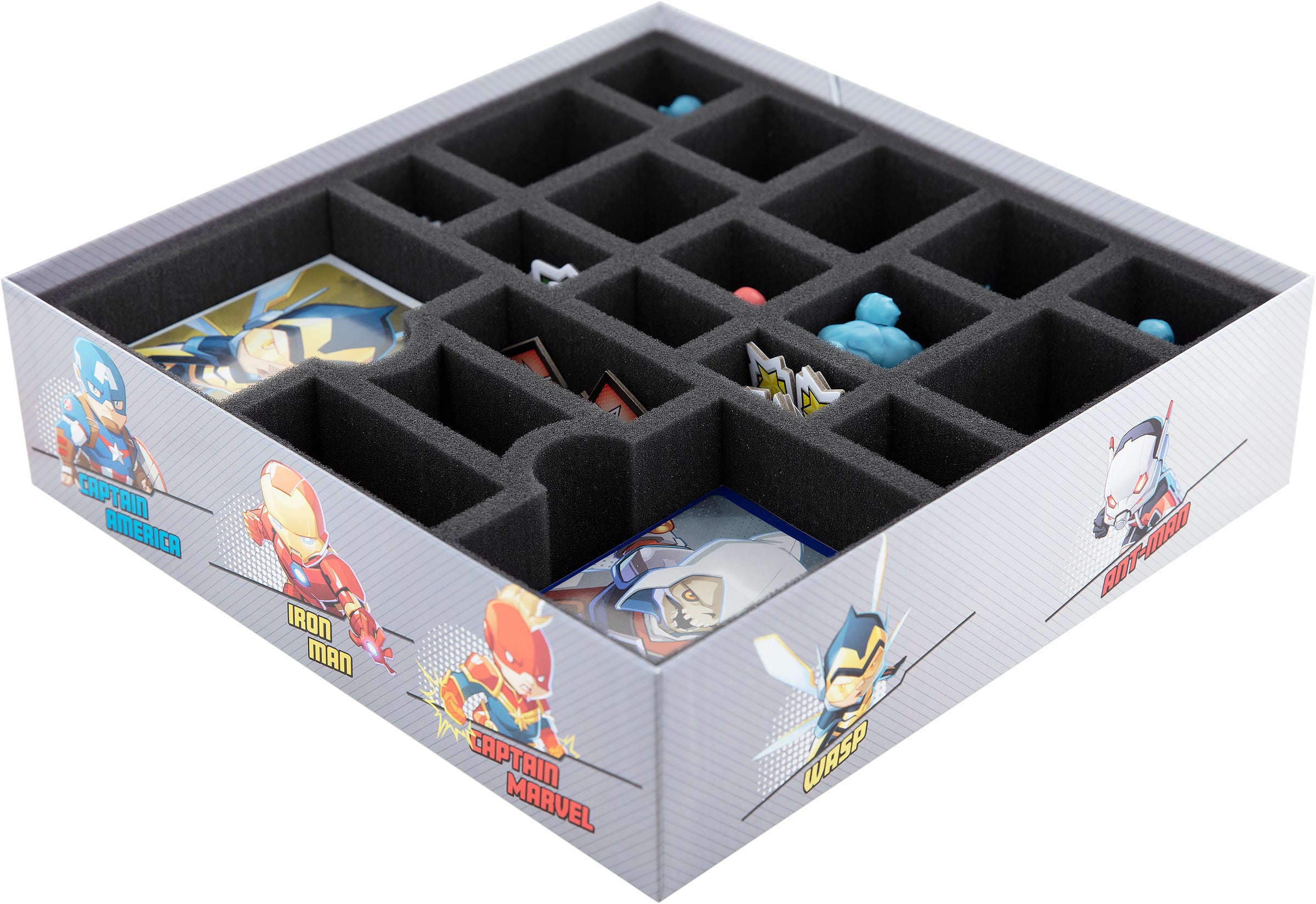 Imagine Iron Man can't save the universe because he is looking for the pieces of his armor. The Hulk can't smash thugs because he lost his pants. With its ten miniatures, 144 cards, 167 tokens, and the rest of the game material, it can quickly become confusing in the game box. And this could spoil the fun you have. To prevent this from happening, we created this Feldherr foam set for your Marvel United core game box.