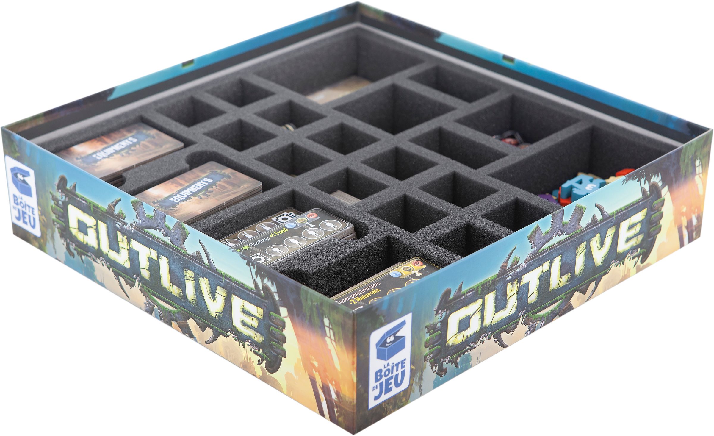 If you want to survive the next game night, you ought to administer your resources with great care. Dozens of tiles, tokens, cards and meeples should always be at hand in order to be successful at „Outlive“. Our custom made foam set will help you get organized.