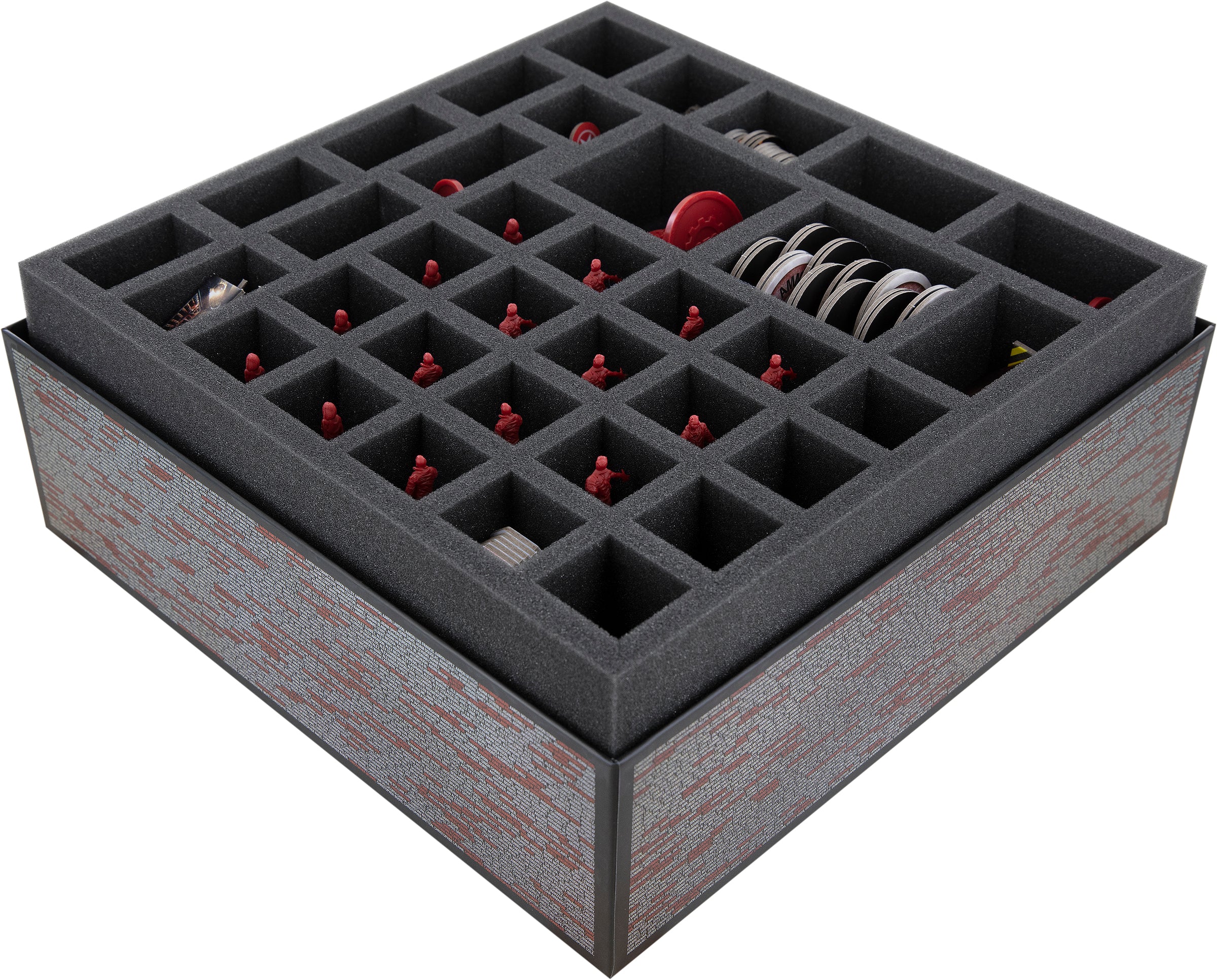 In the board game adaptation of the video game, hordes of intricately modeled Undead and daring Heroes await you. We can't stop you from meeting a horrible end, but we can make sure that your miniatures and game materials are well taken care of. With this Feldherr foam set, designed to fit into the original board game box, you can keep all the contents of the core game in the Kickstarter Edition safe and neat.
