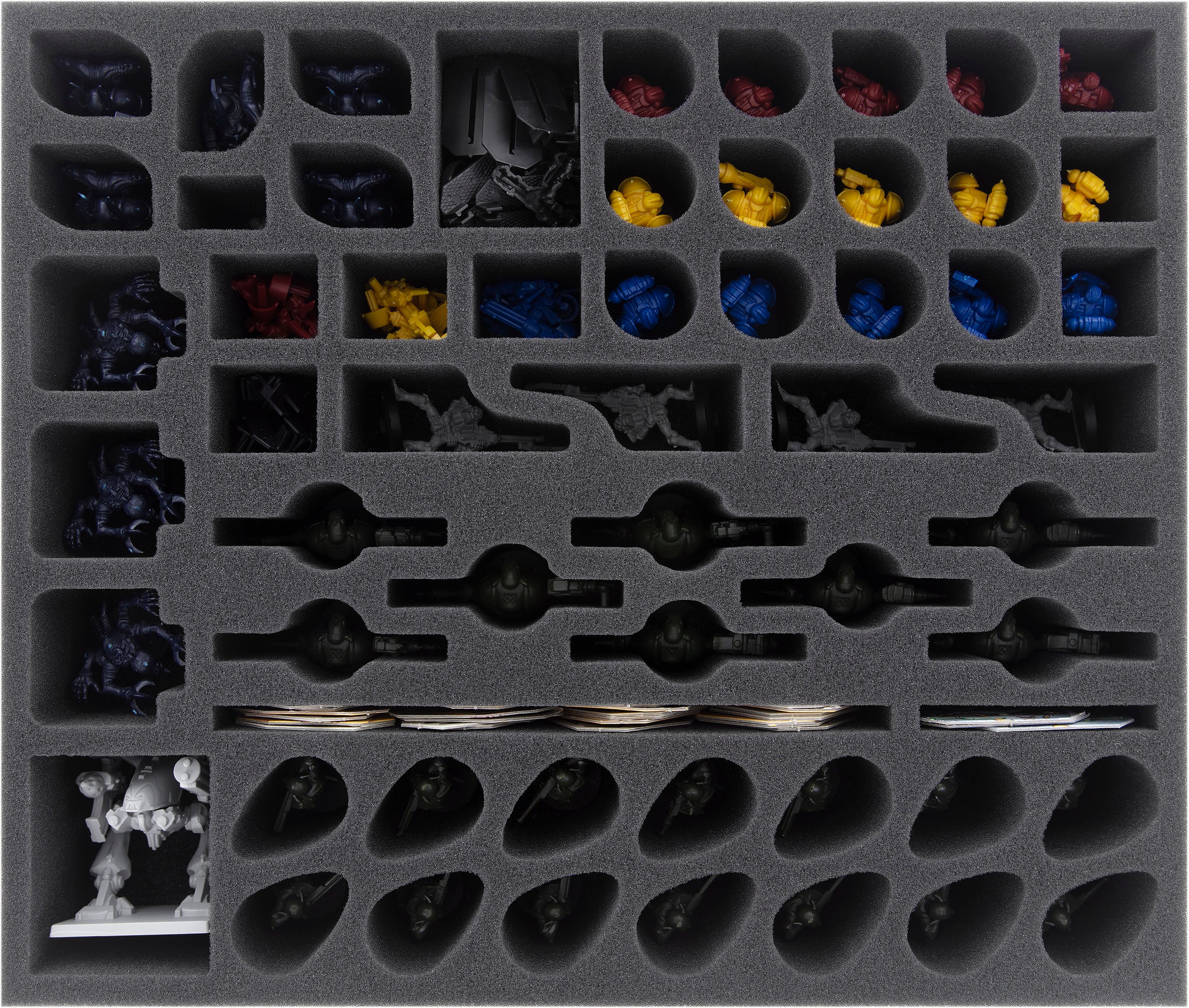 - Offers space for all 50 miniatures and the complete game accessories of the core game.