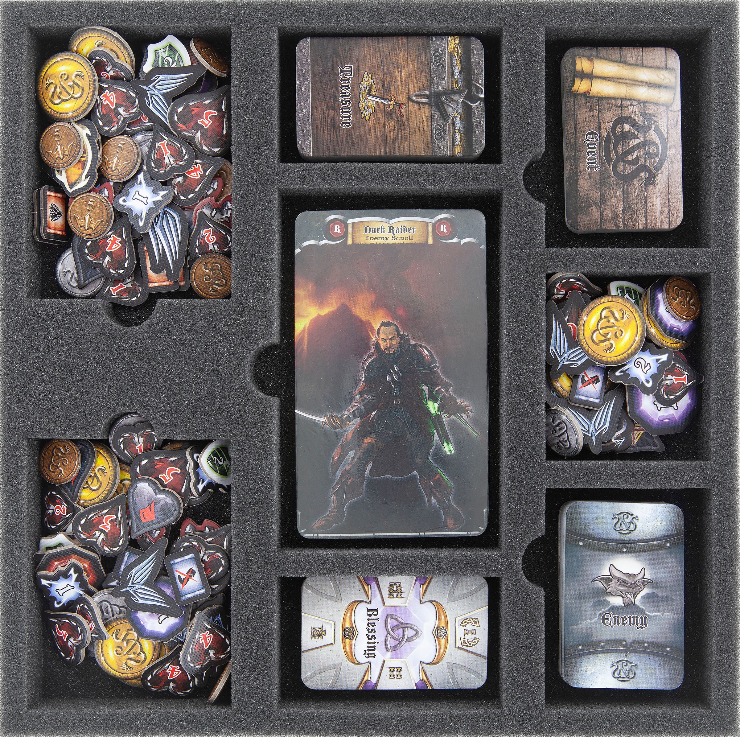 The „Darkness Falls“ expansion for Sword and Sorcery contains a lot of exciting, new game material. To assist you in keeping your new miniatures, tokens and cards in order, we created a new foam set for the original game box.