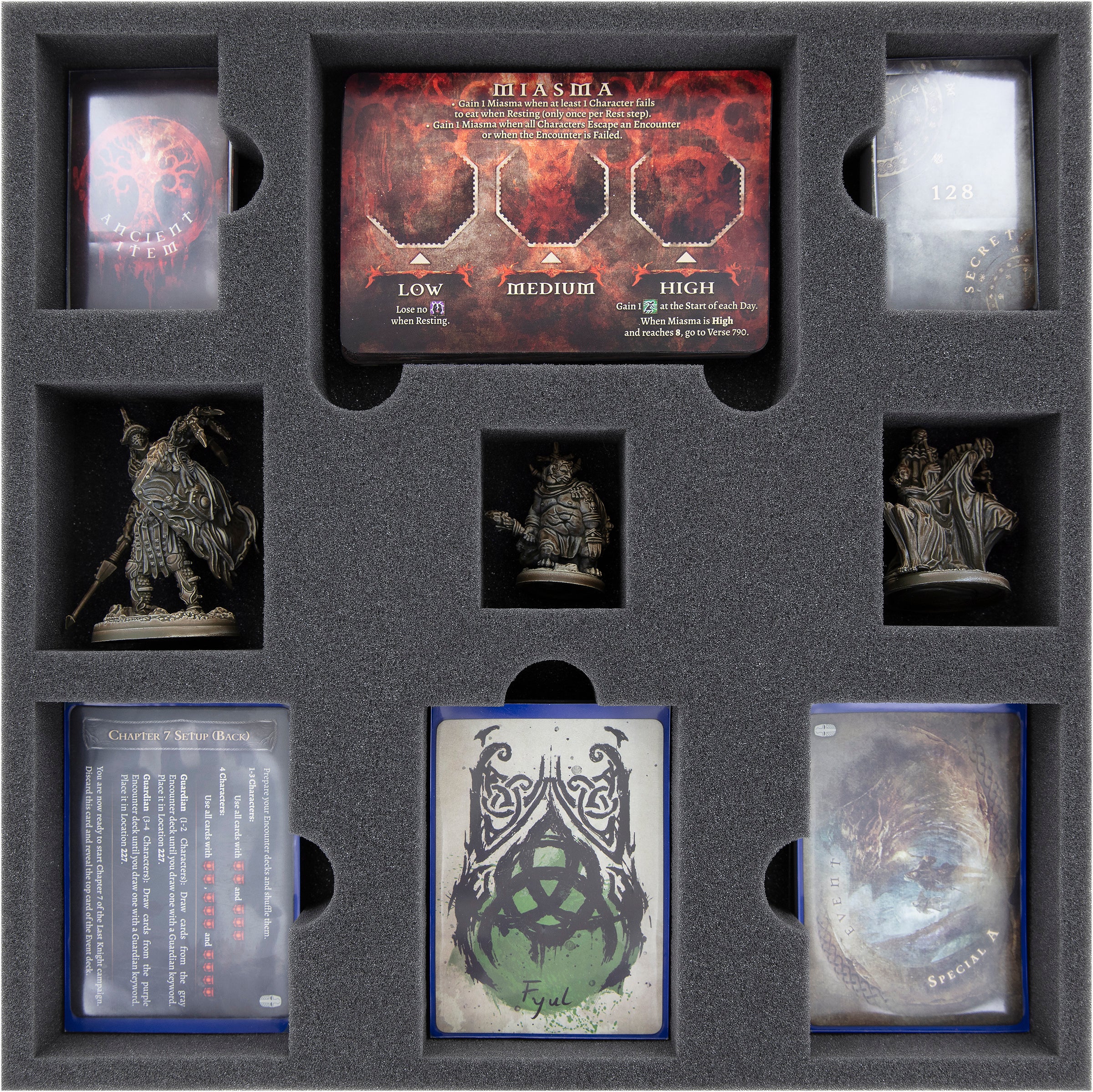 The insert offers a total of 9 compartments for your models and cards. Danse Macabre, Plaguebeast and Fomorian Sentinel each get their own compartment. Thanks to the custom-fit cut, the miniatures have a tight fit.