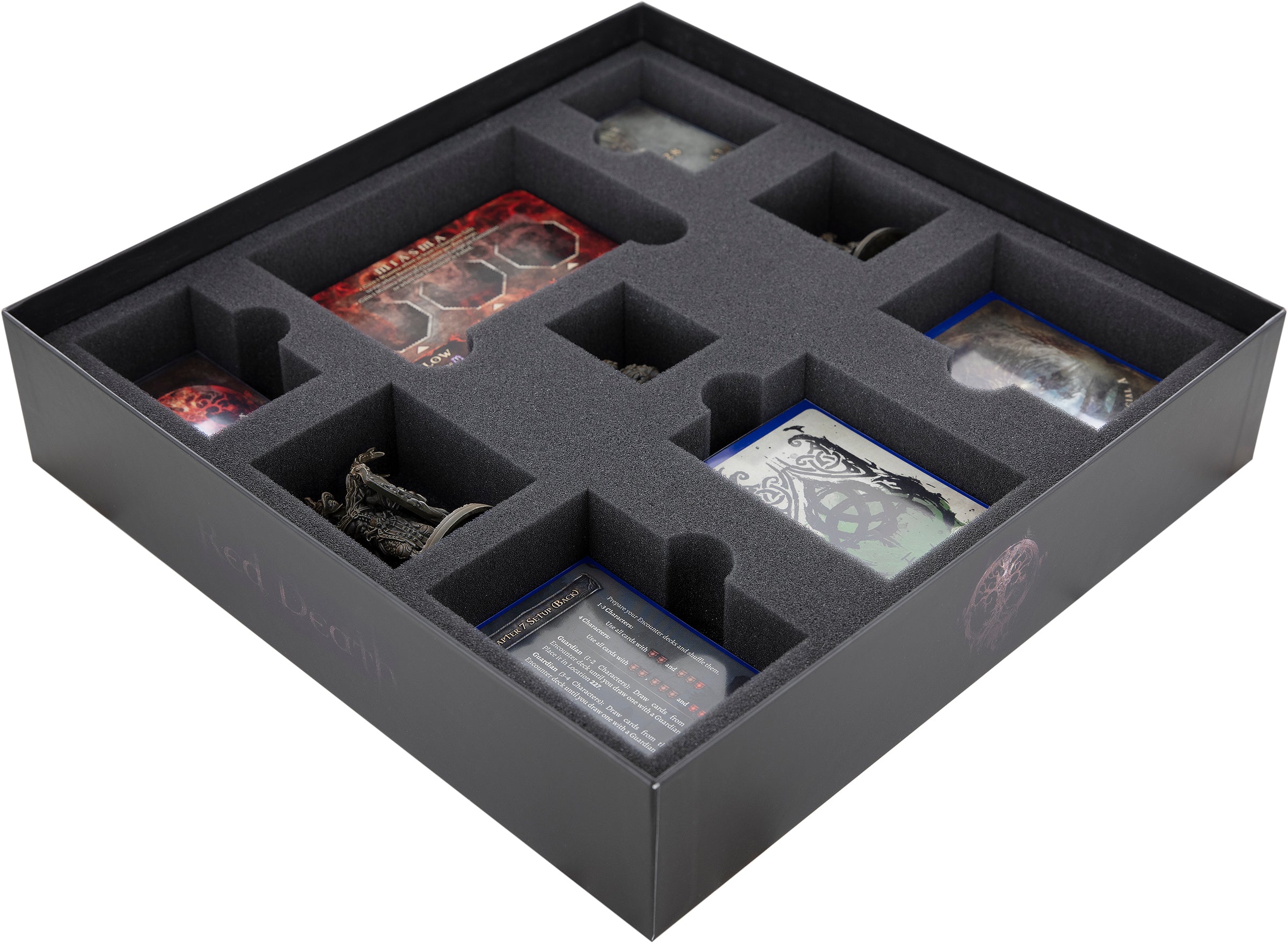 - It has room for all the plastic miniatures and for all the game material of the "Red Death" expansion.