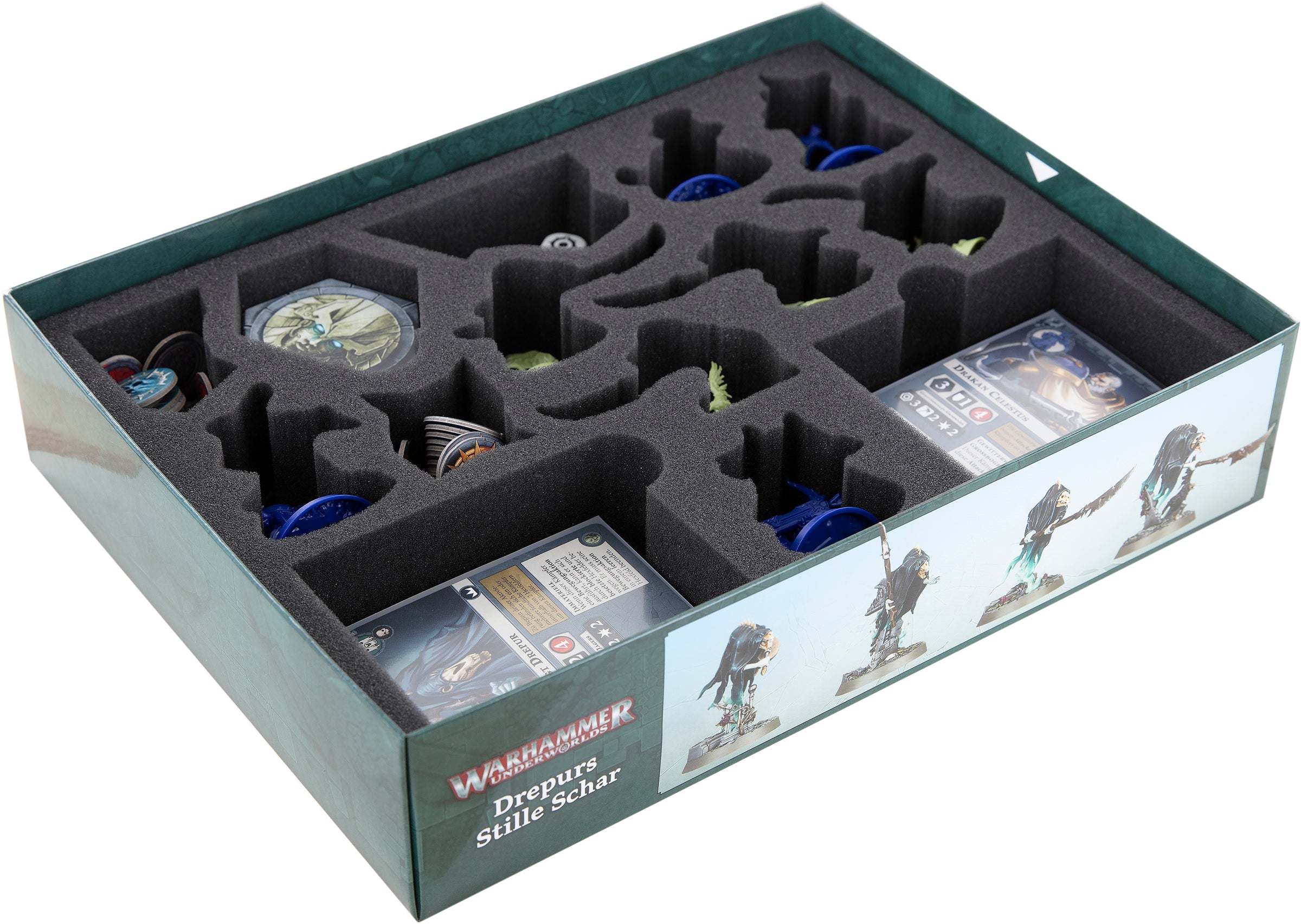 There are eight compartments available for your miniatures. The models of both warbands “Storm of Celestus” and “Drepur's Wraithkeepers” both receive miniature-precisely cut compartments.
