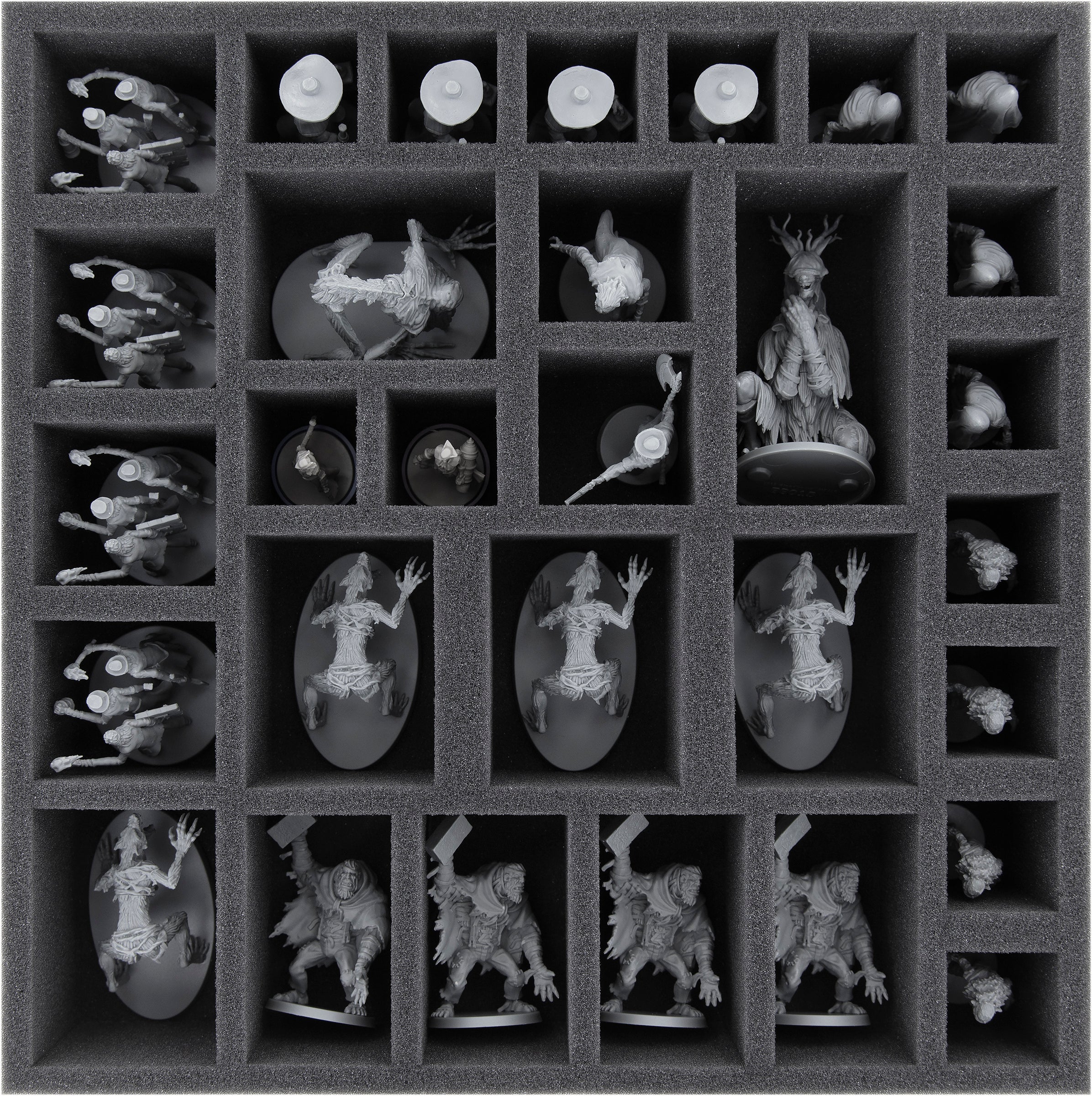 In Yharnam's dark alleys many a danger awaits you. Angry mobs and mighty beasts endanger your life. Broken parts, ugly scratches, and paint abrasion threaten your painted miniatures. We've included two foam trays to protect your miniatures so that you only have to fear the monsters from harming you. Tailor-made compartments ensure that each miniature of the core game is safely and neatly stowed away. The precise cut prevents the figures from sliding around and bumping into each other during transport. This protects filigree details and your painted models will not suffer from abrasion and scratches.