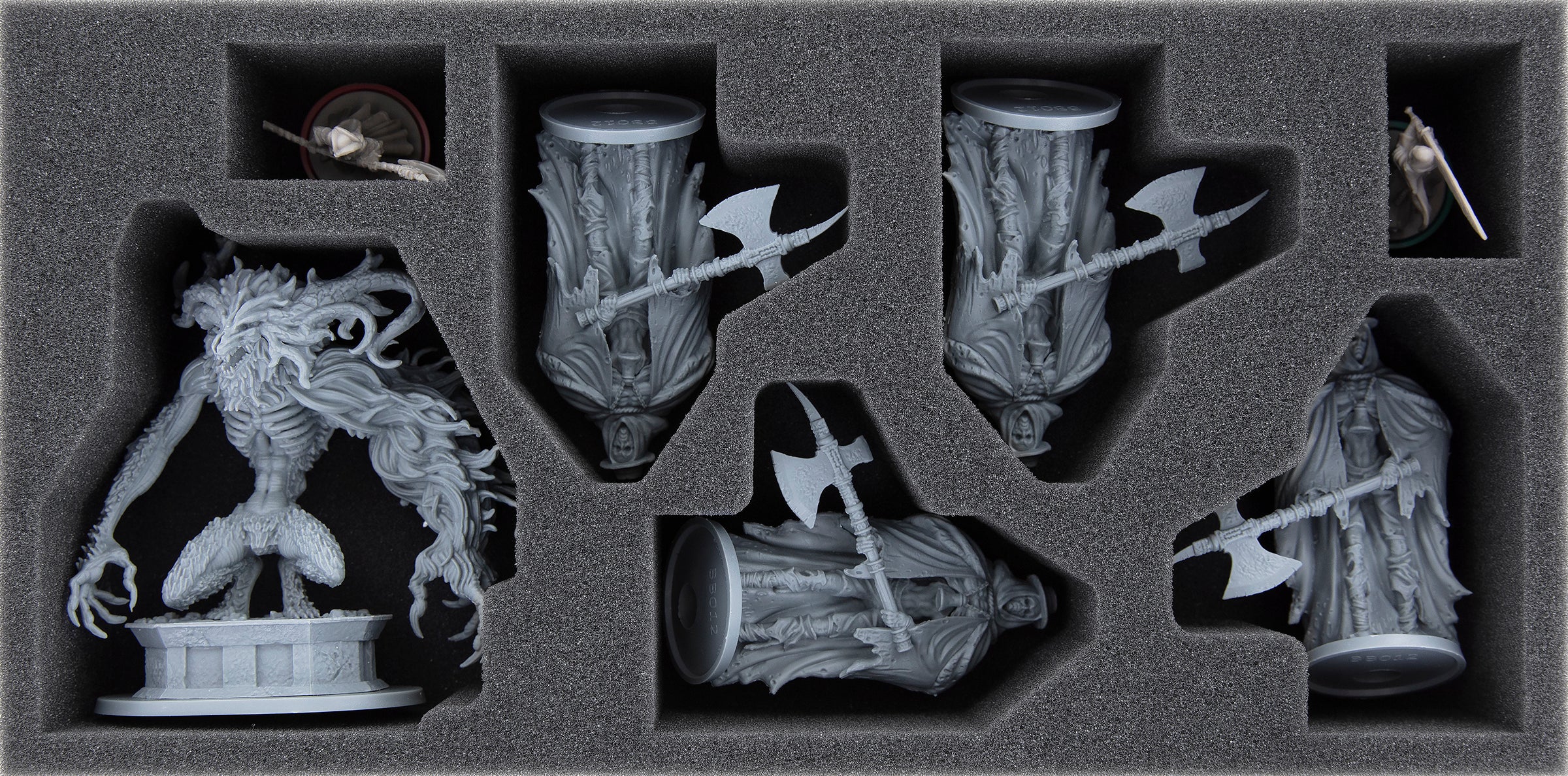 After all miniatures, as well as game material, are neatly stowed away, you cover the inserts with the matching foam toppers. This way, the miniatures are protected from all sides.