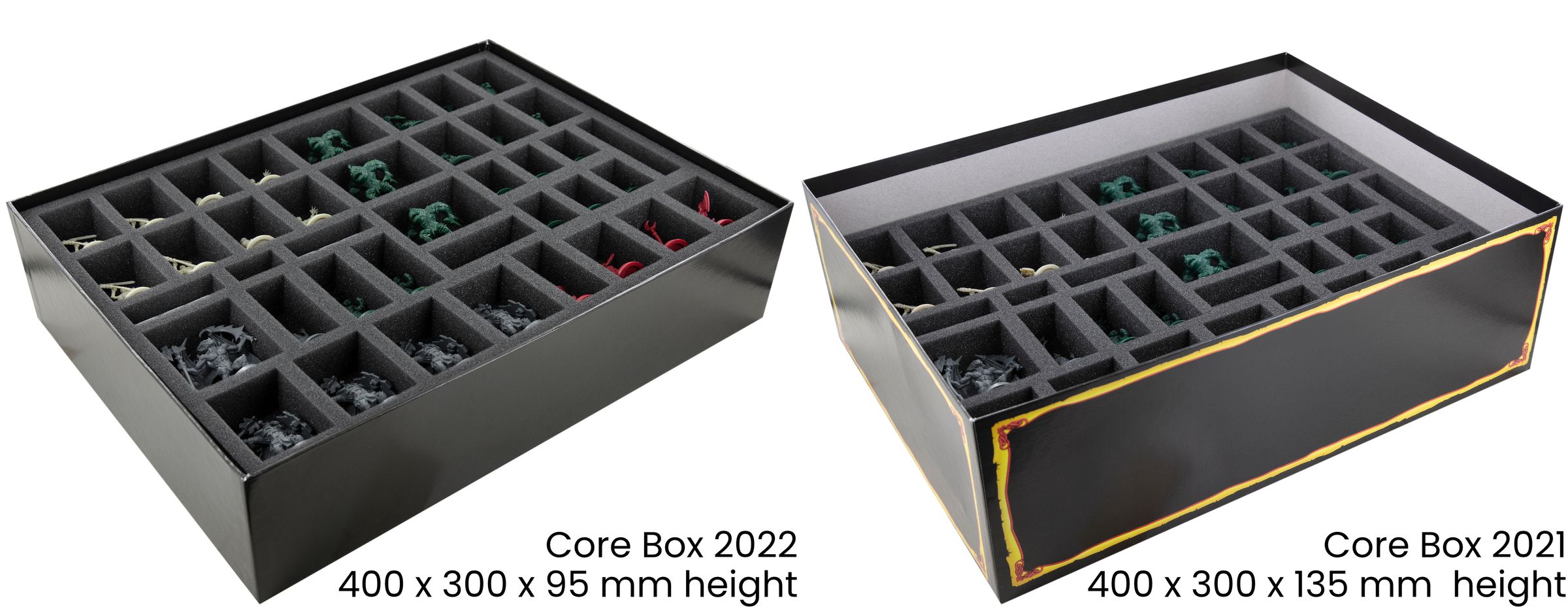 - The set contains foam topper of different heights to choose from, depending on whether you have a tall or flat board game box. Both versions close flush. The foam toppers for both versions are included in the set.