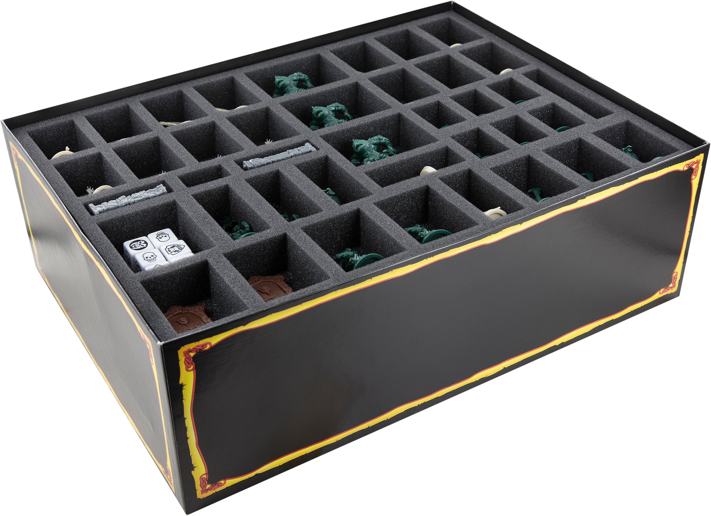 - All miniatures, game cards, and the entire game materials from the core game, the two expansions “Kellar's Keep” and “Return of the Witch Lord”, as well as the additional content from the exclusive Mythic box can be neatly stored in the foam set.