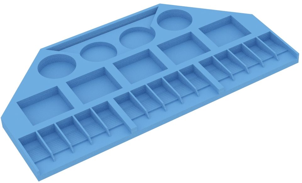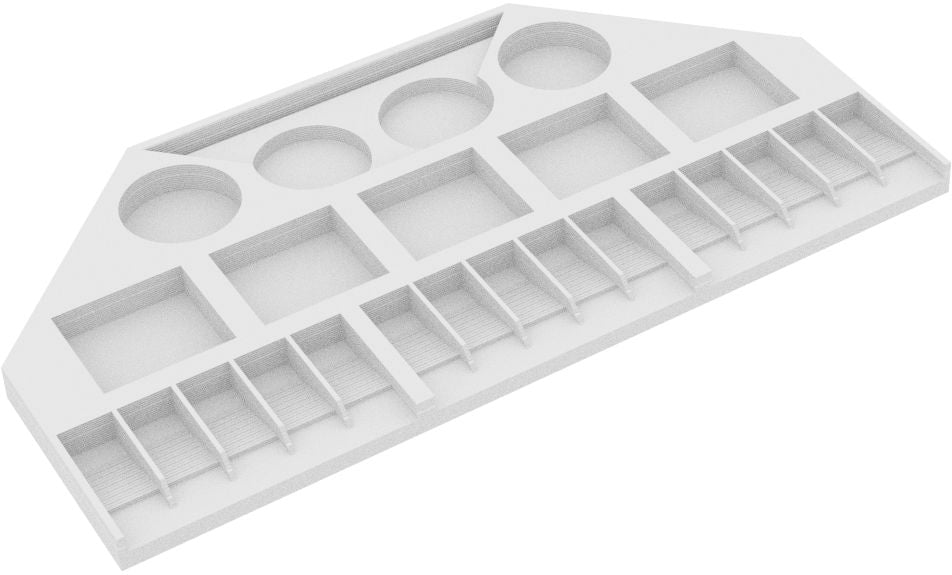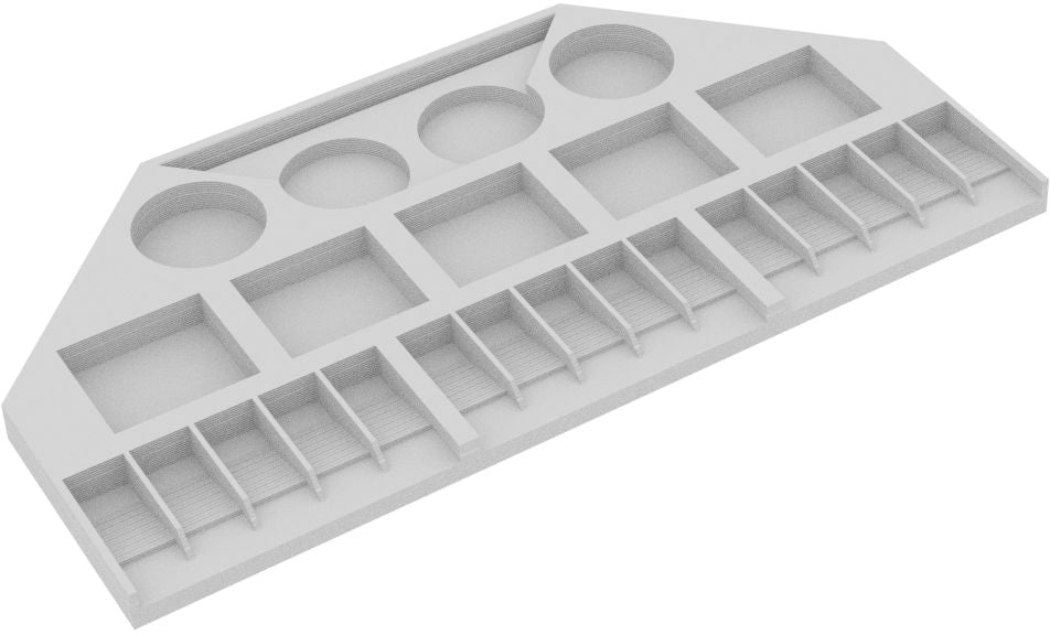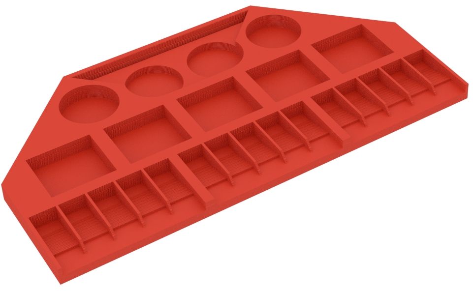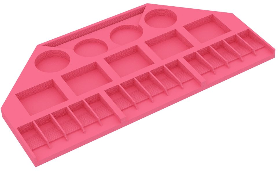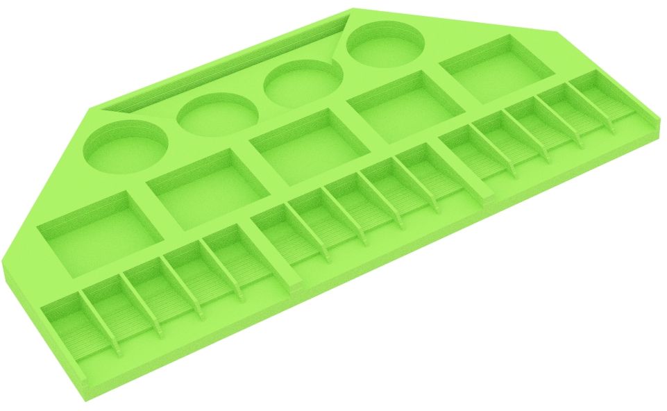 - The models of the cities and settlements are stored in deep compartments, while the compartments for the streets slope inwards. The miniatures don't slip during play but can be easily removed from the compartments.