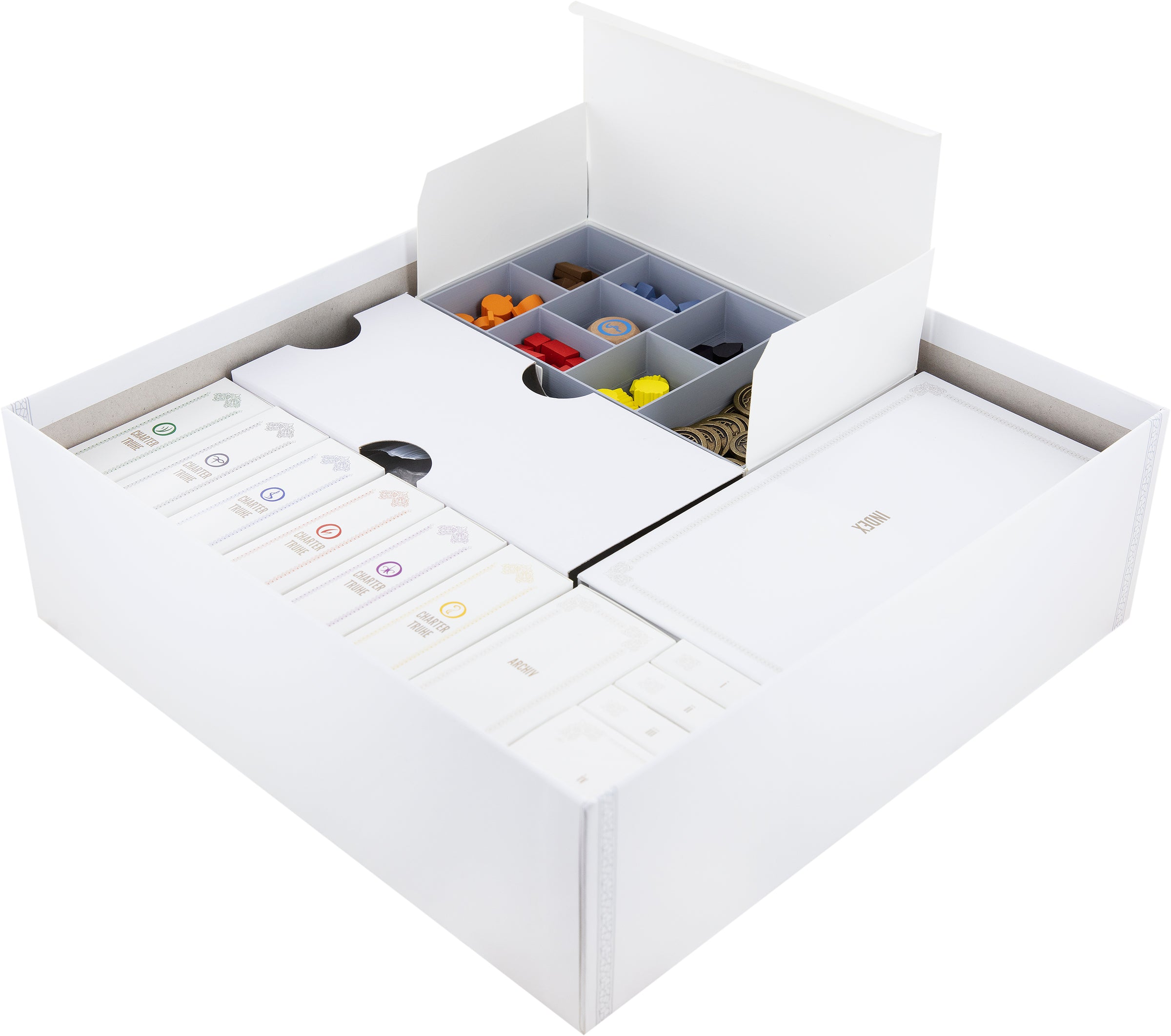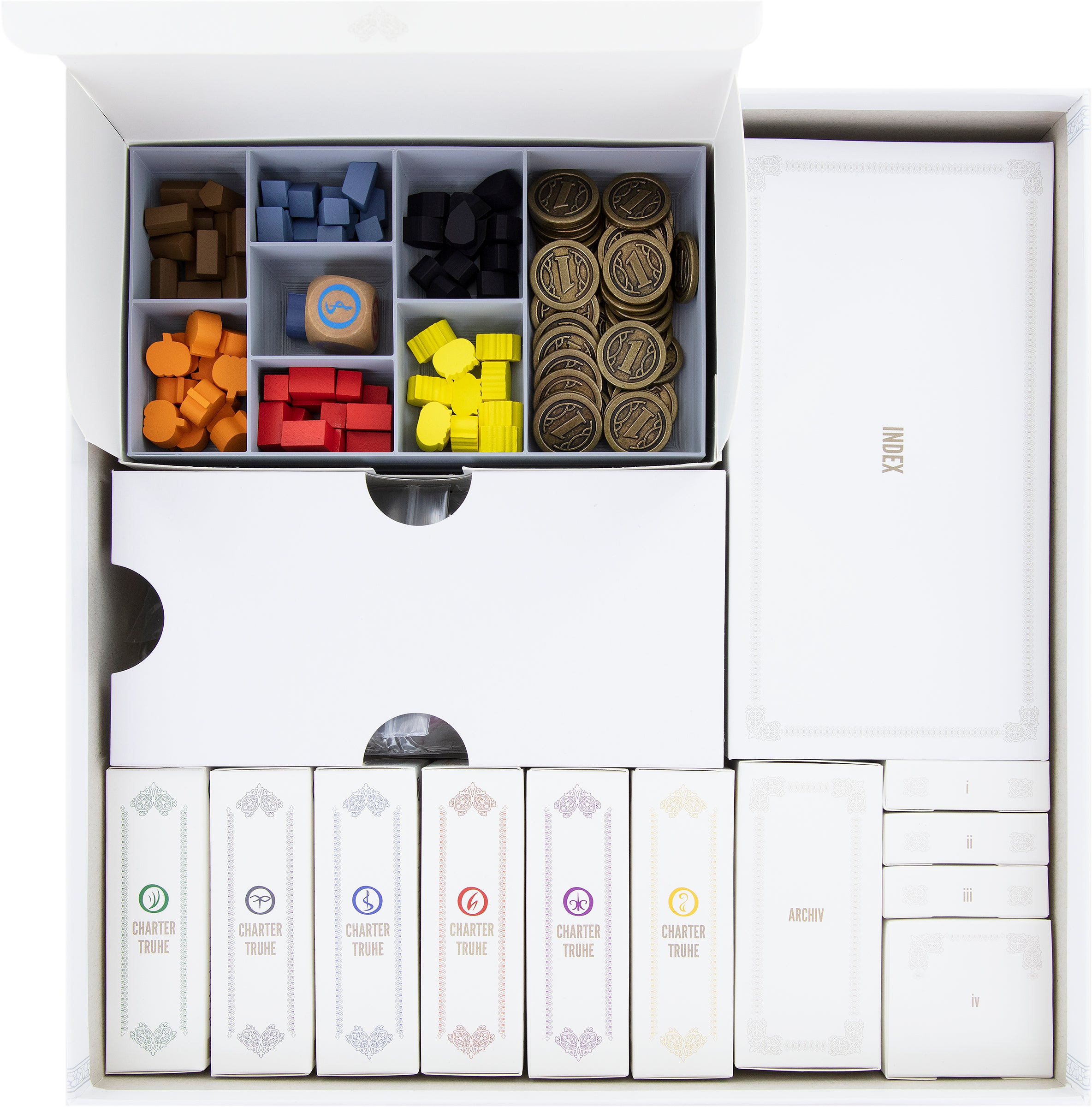 To ensure that all the contents of the board game box have a tight grip, the various cardboard inserts are needed even after unlocking the game materials. Charter Chests, the Archives and Boxes i-iv, as well as the Scriptorium Box and Index Box, provide the necessary stability in the board game box.