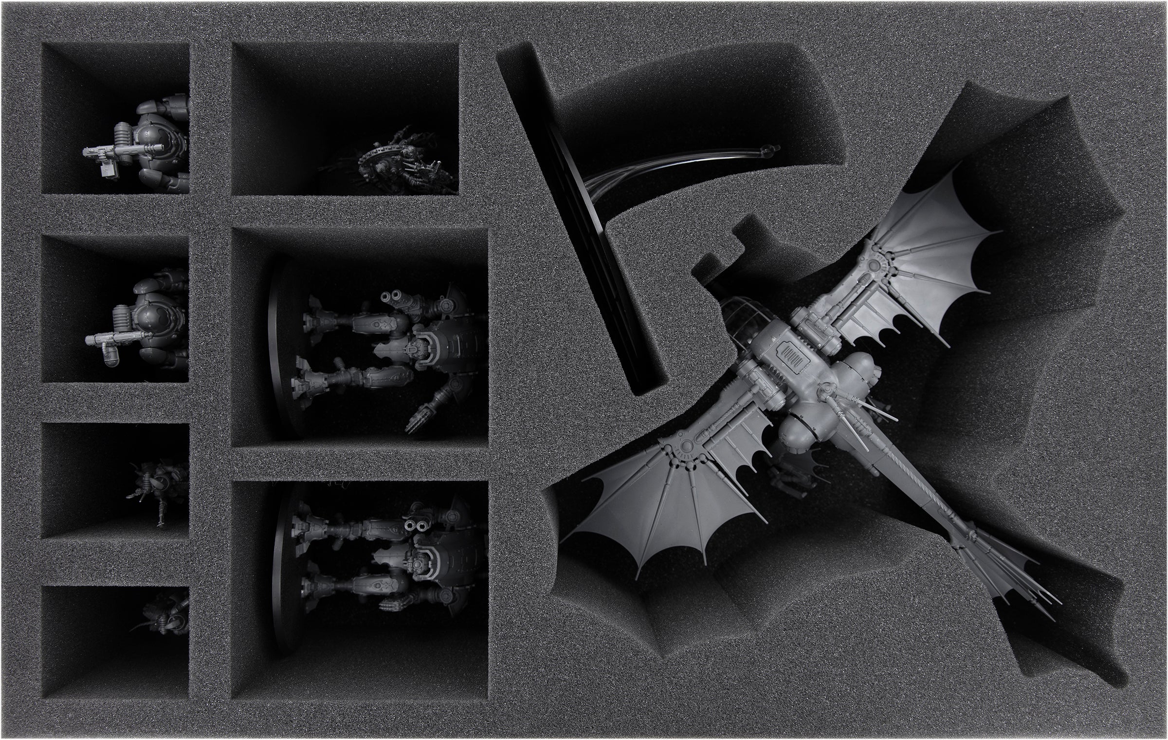 - 1 Full-Size foam tray with 5 miniature-precisely cut compartments for Pteraxii Skystalkers, Pteraxii Sterylizors, four additional compartments for Serberys Raiders, Sulfurhounds, and similar-sized models (FSMEXU075BO)