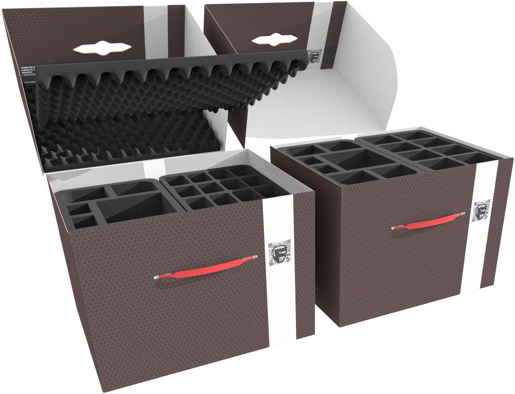 The Storage Box FSLB250 is made of coated, double-walled cardboard. This makes it not only pleasantly light, but also particularly tear-resistant and stable. With the matching foam trays, miniatures and game material can be stored safely and dust-protected and can also be transported effortlessly with the plastic carrying handle.