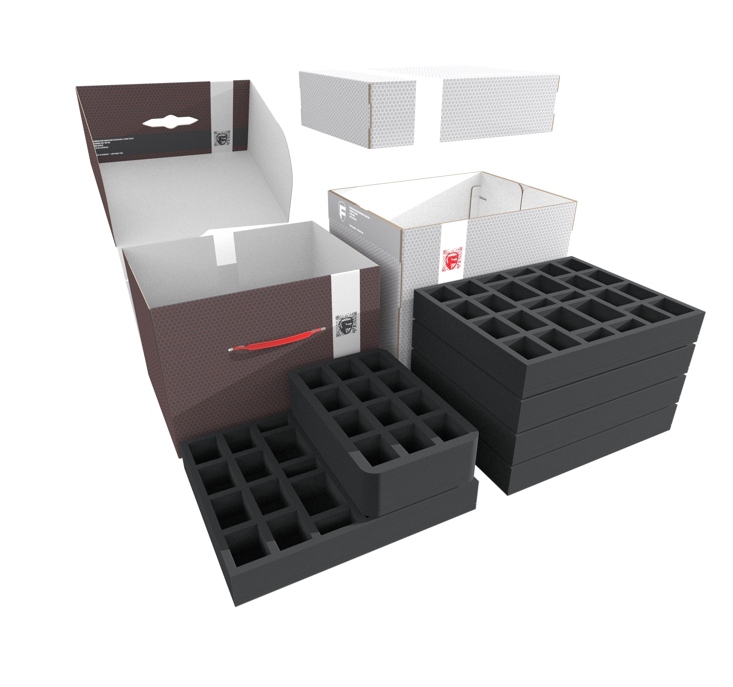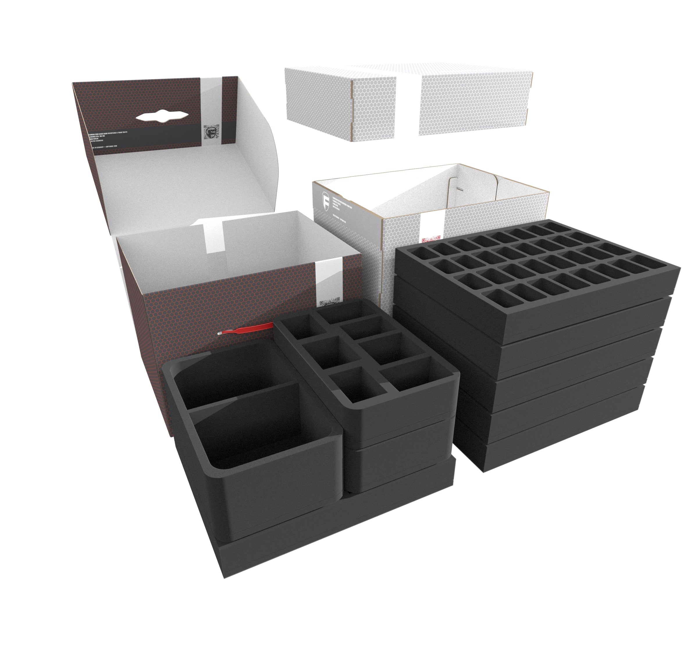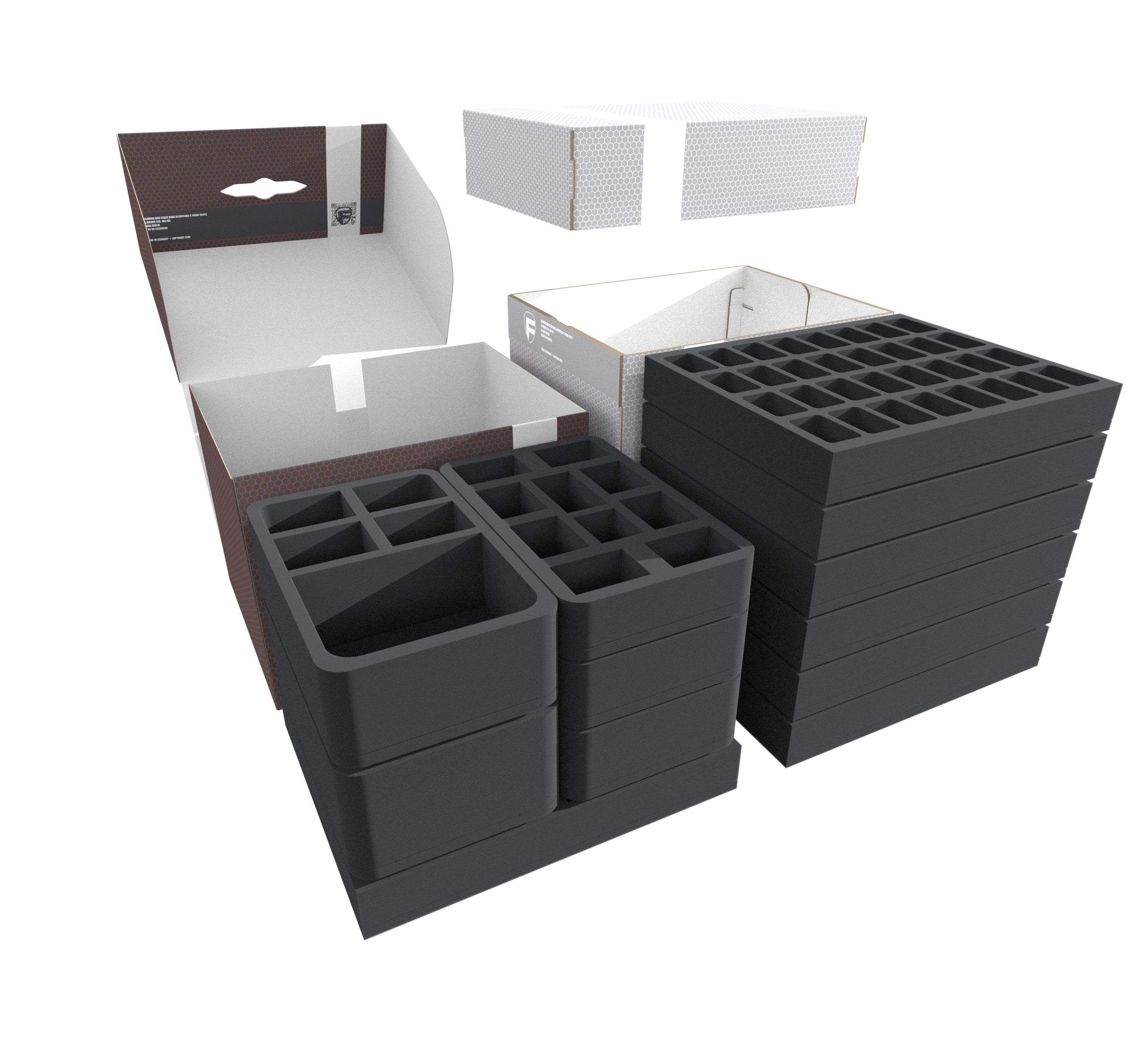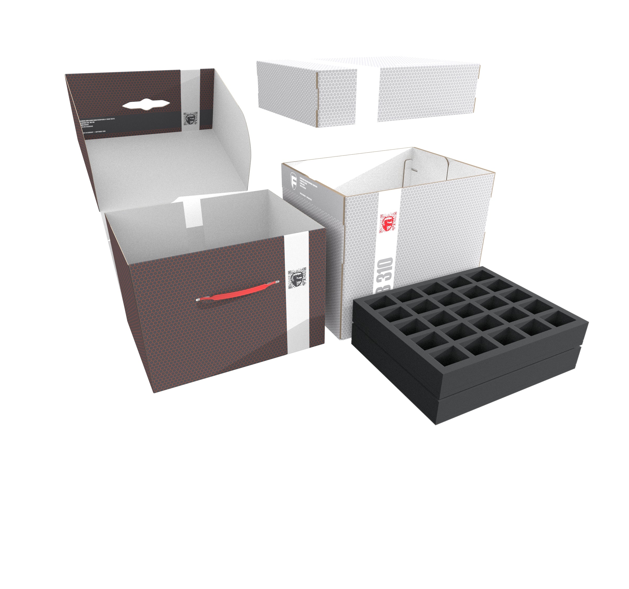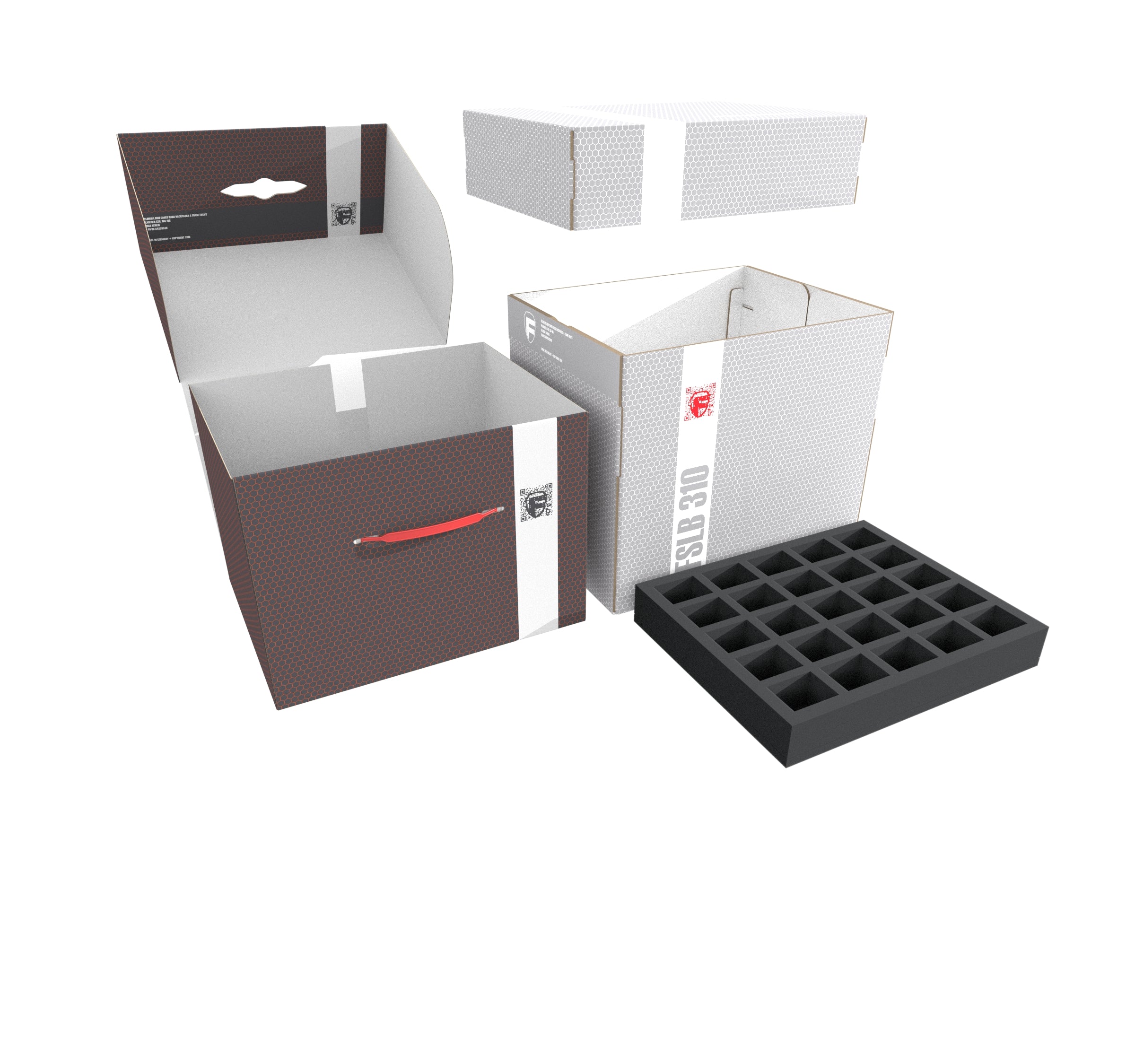 The Storage Boxes FSLB310 and FSLB250 consist of coated, double-walled cardboard and are, therefore, very light and stable. With the matching foam trays, miniatures and game material can be stored safely and dust-protected and can also be transported effortlessly with the side handles of the FSLB310 or the top handle from the FSLB250.