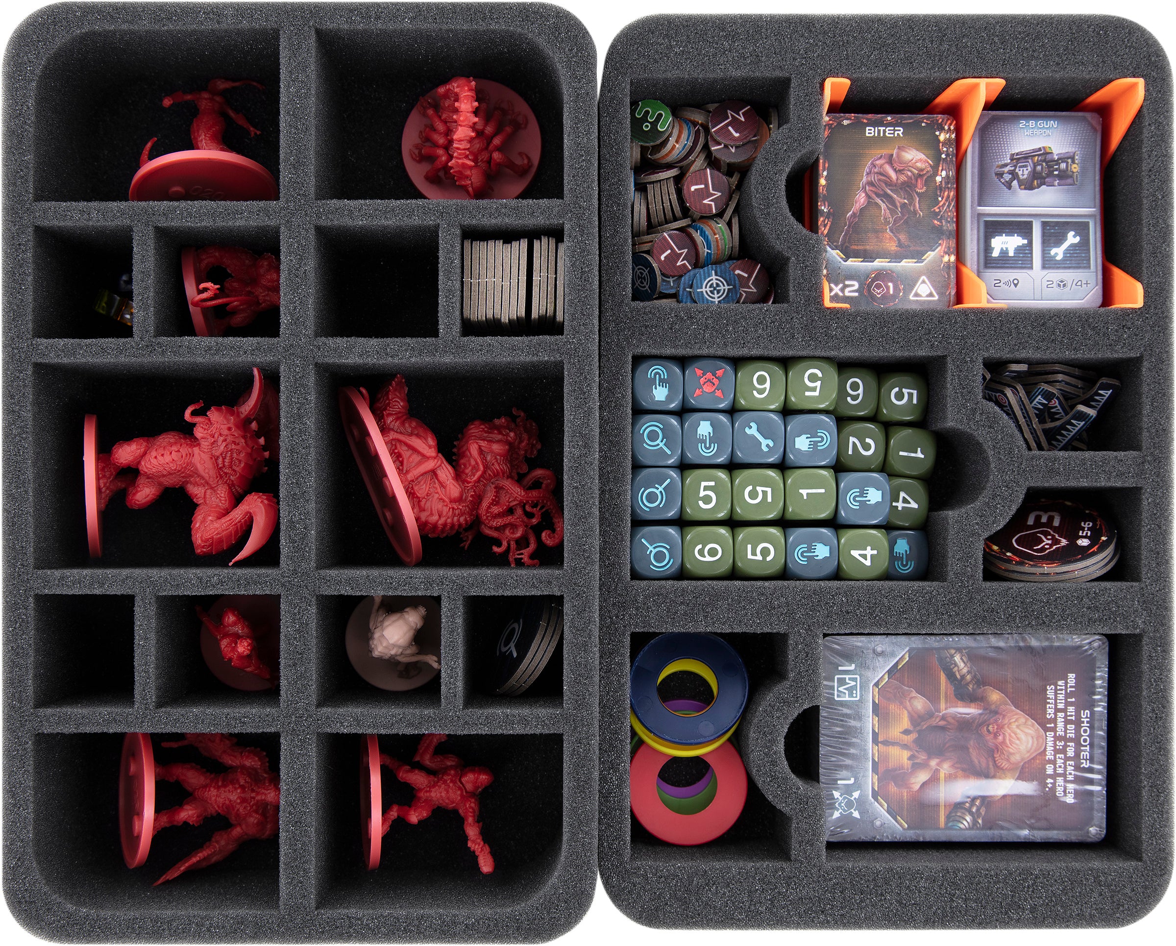 Individual inserts with special compartments for cards, dice, tiles, and tokens help you to keep your game material always compact, organized, and safe. You keep track of your game materials, save time when setting up the game and can concentrate on the important things of life: load, aim, fire, and collect alien scalps. Always remember: The only good alien is a dead alien.