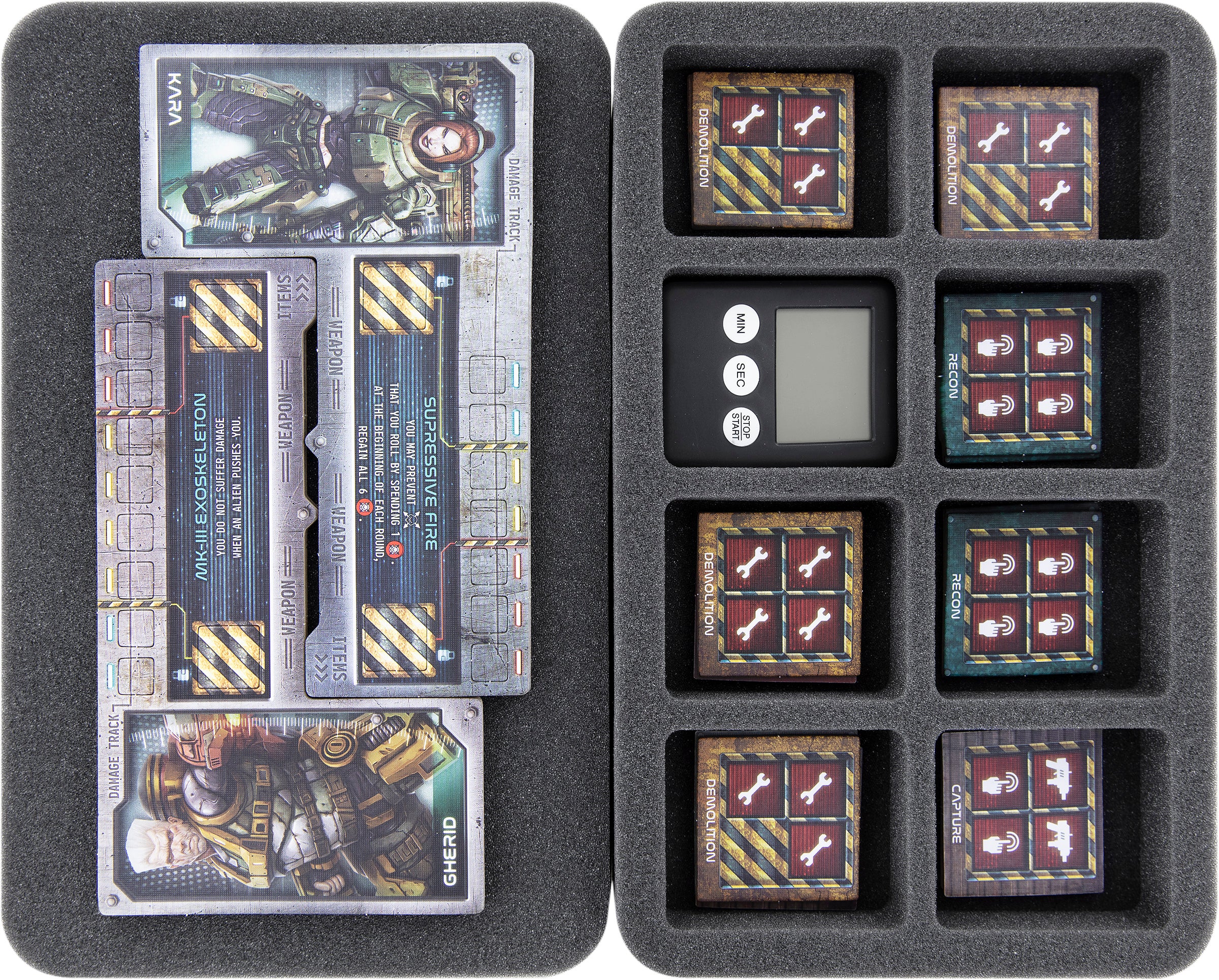 - 2 Half-Size foam trays + 3D insert for game material and miniatures (HSMEQO50BO + 60432)