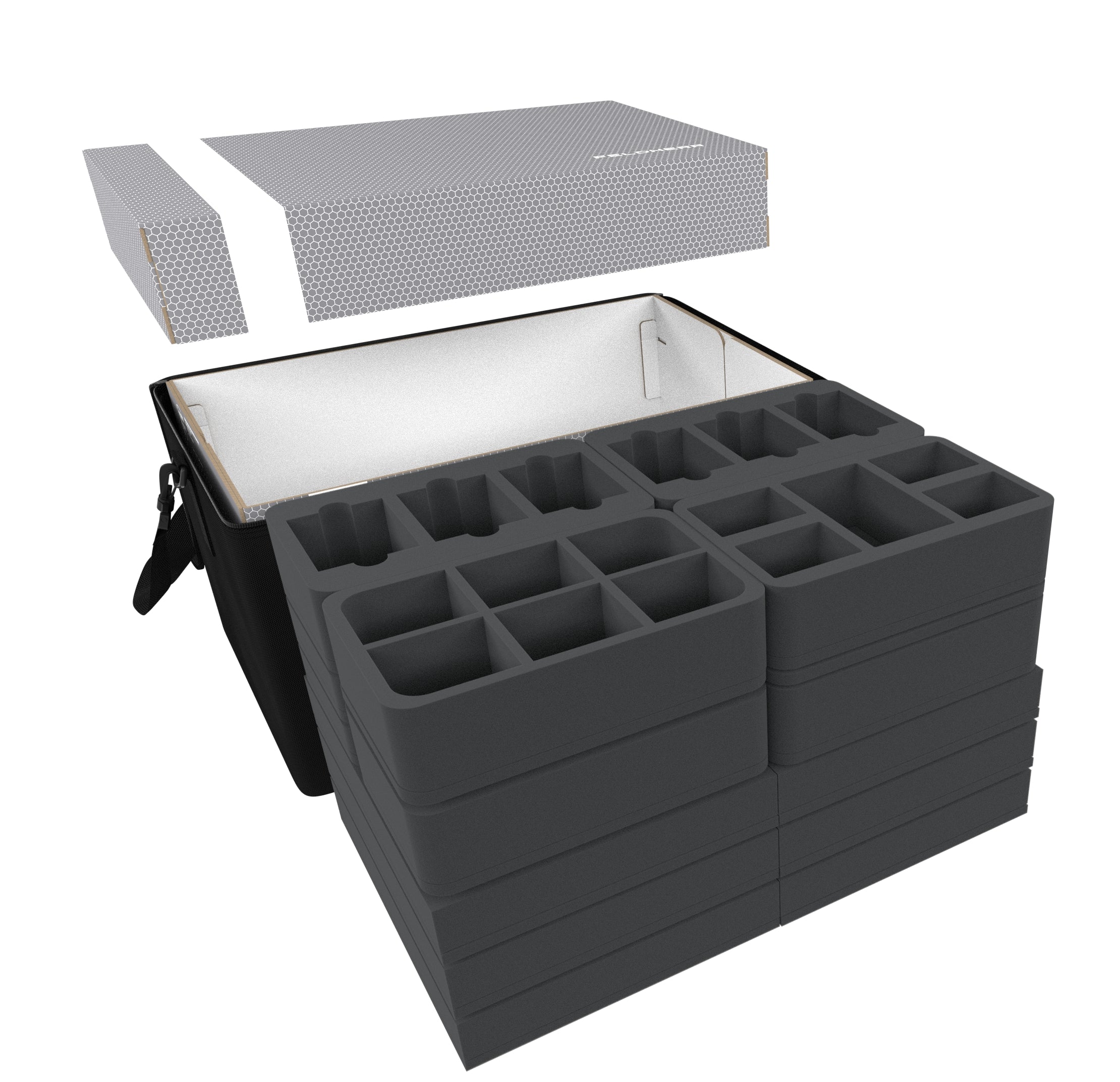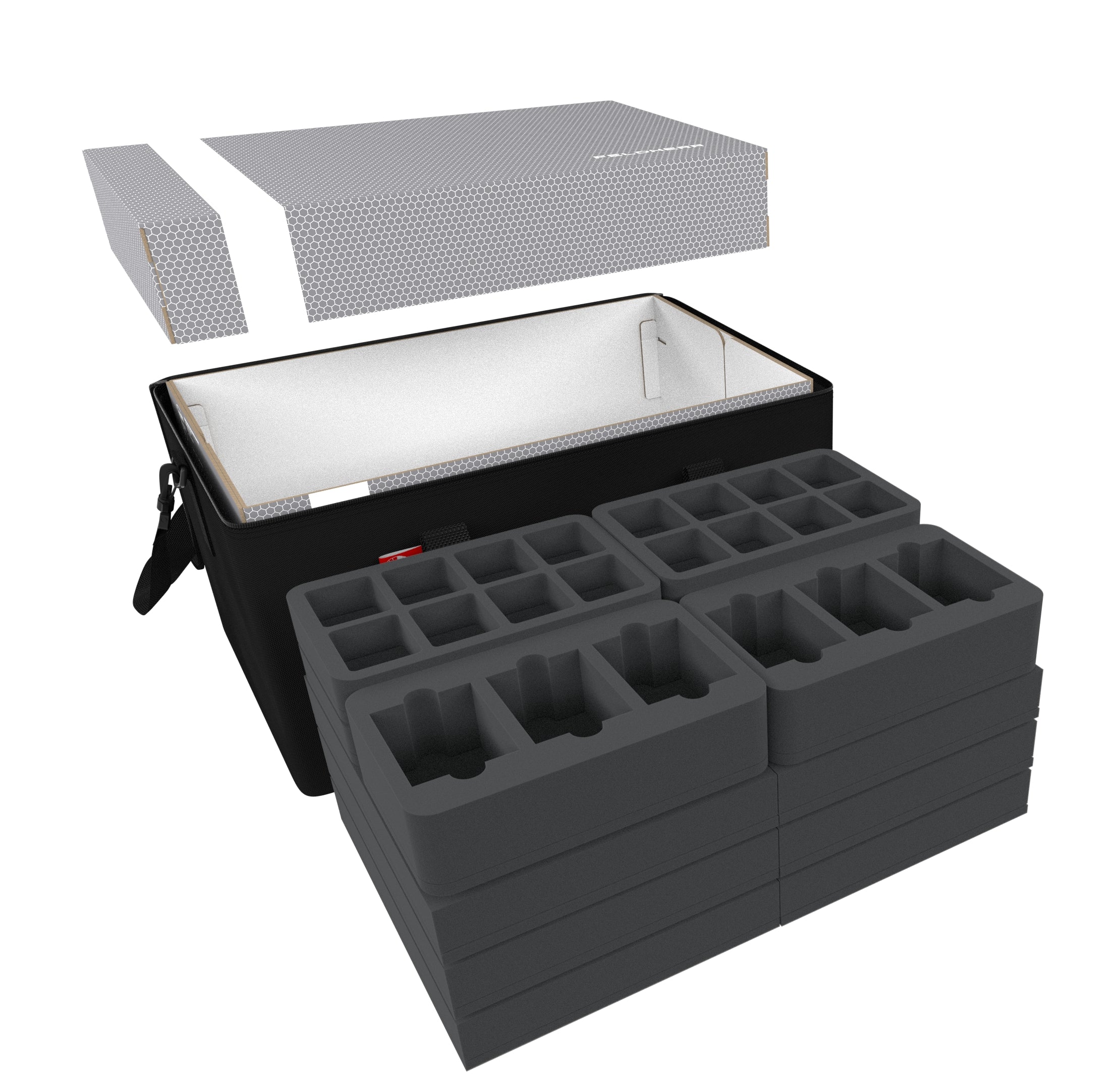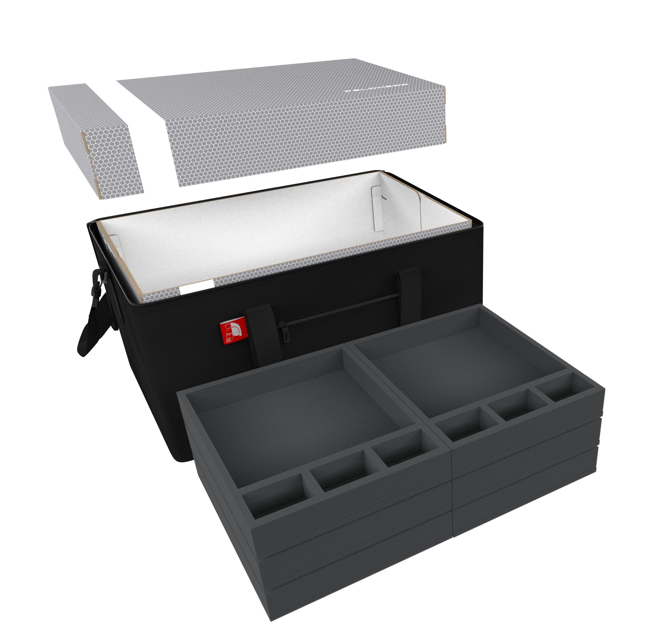 We would like to present you the Feldherr Transporter-Set for the board game "Forbidden Fortress" from the "Shadows of Brimstone" series. The set includes the practical Feldherr Transporter bag, a stable Double-Size Storage Box and the matching foam trays for all heroes, demons, monsters, (sleeved) cards, tokens, dice and many tiles of the core set.