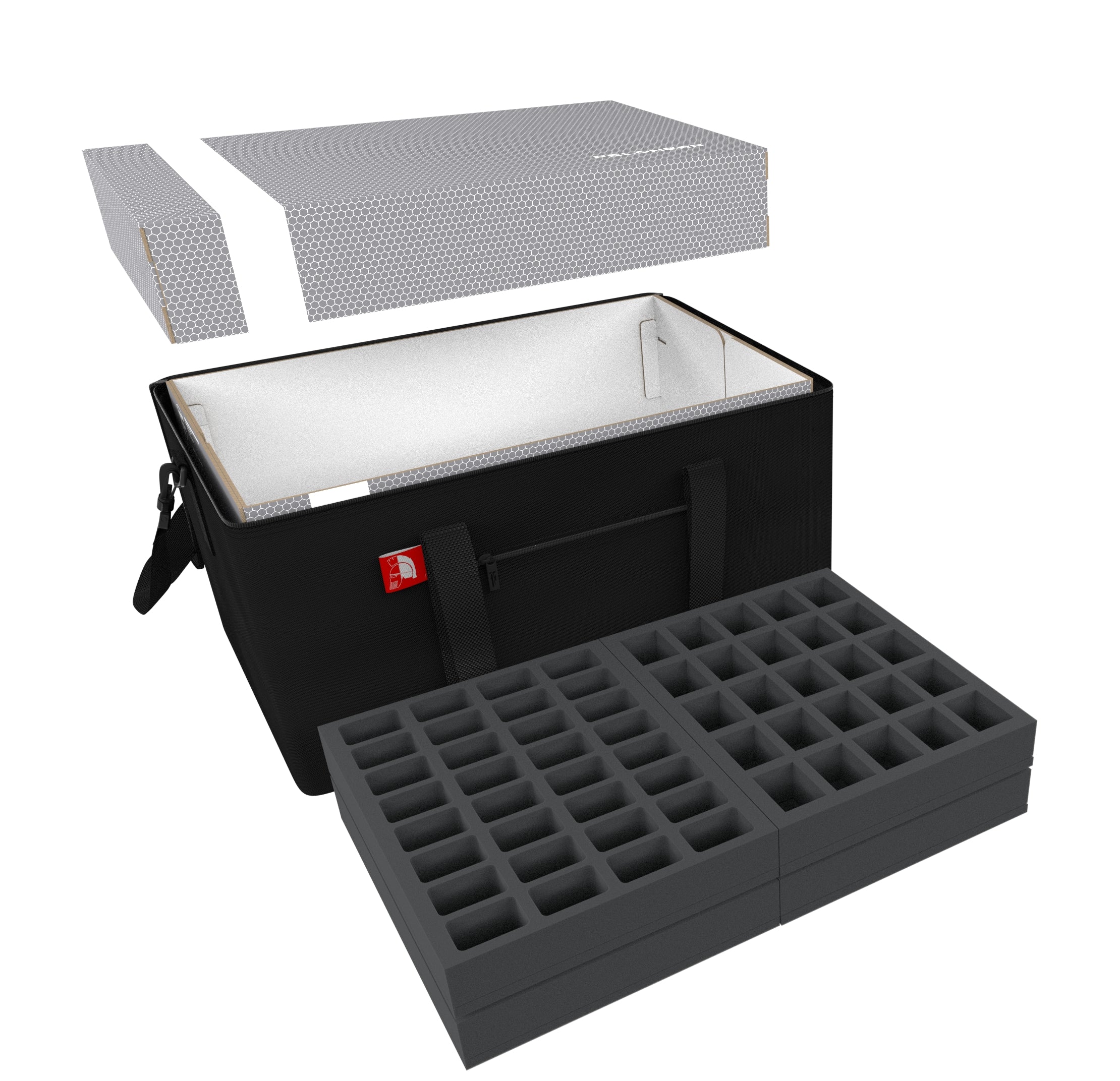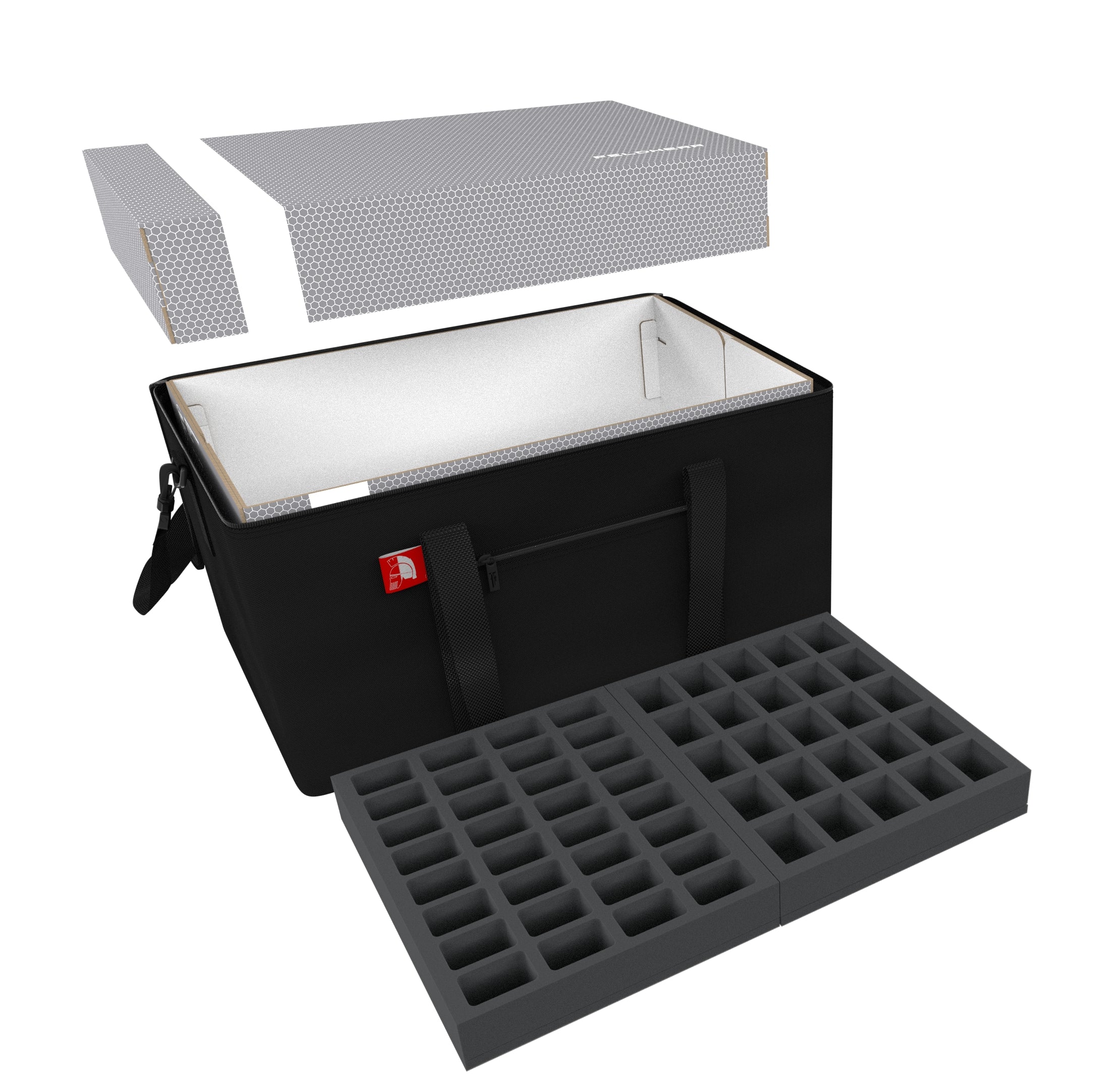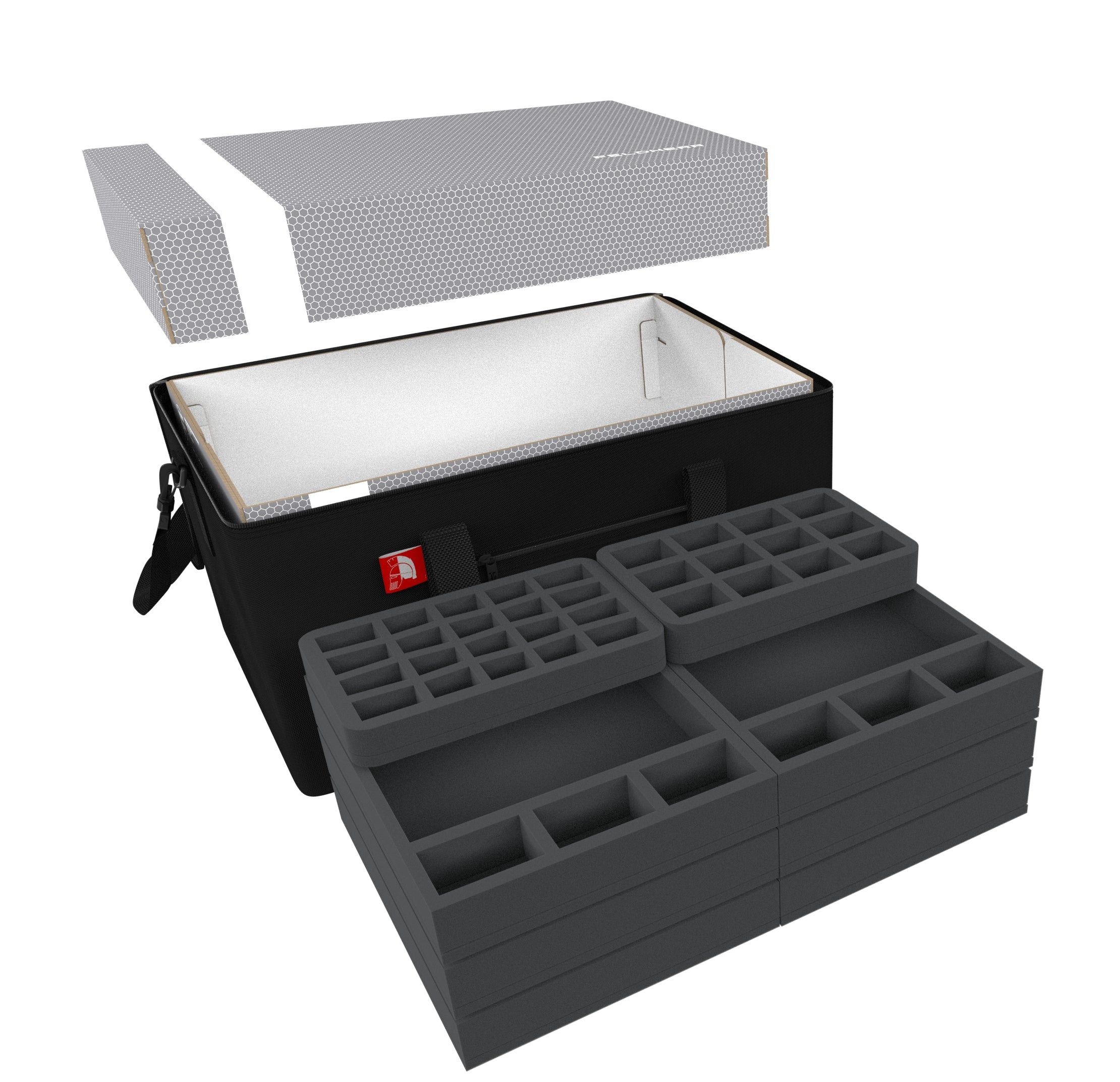 We would like to present you the Feldherr Transporter-Set for the board game "Forbidden Fortress" from the "Shadows of Brimstone" series. The set includes the practical Feldherr Transporter bag, a stable Double-Size Storage Box and the matching foam trays for all heroes, demons, monsters, (sleeved) cards, tokens, dice and many tiles of the core set.