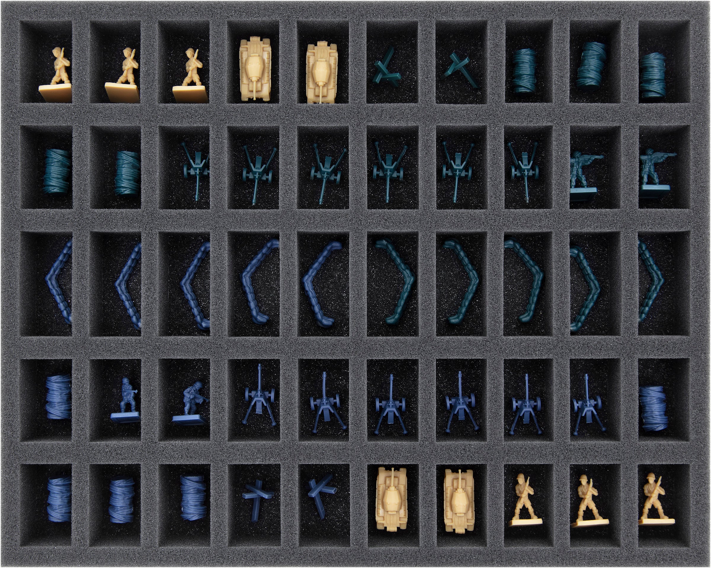 This Feldherr foam tray offers you space for 50 models for Memoir ‘44. The insert is ideal for storing terrain pieces like hedgehogs, barbed wire or military miniatures like artillery and infantry or miniatures of similar size.