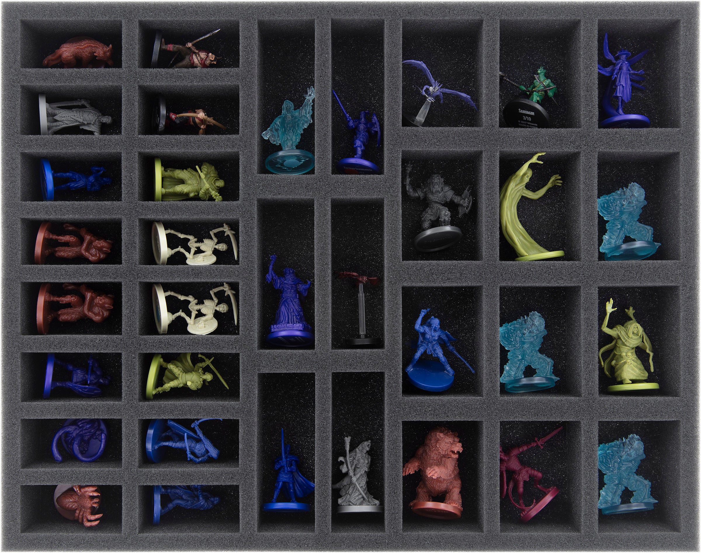 The insert is especially suitable for most WizKids D&D miniatures in the sizes Small and Medium. Of course the Dungeons and Dragons figures in 25/28 mm scale from other manufacturers (e.g. Reaper, GF9) are padded softly here as well.