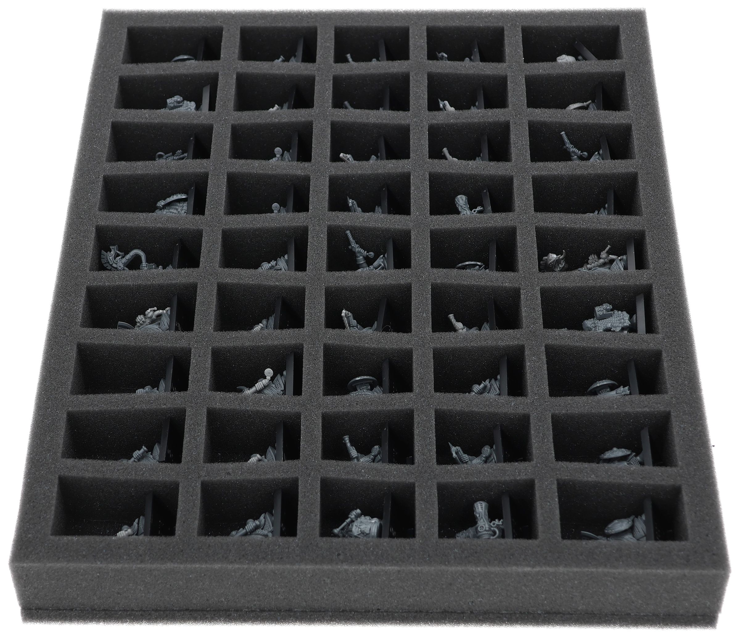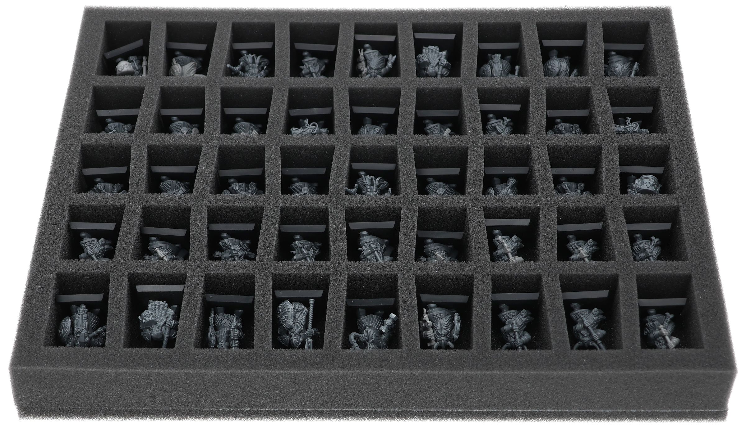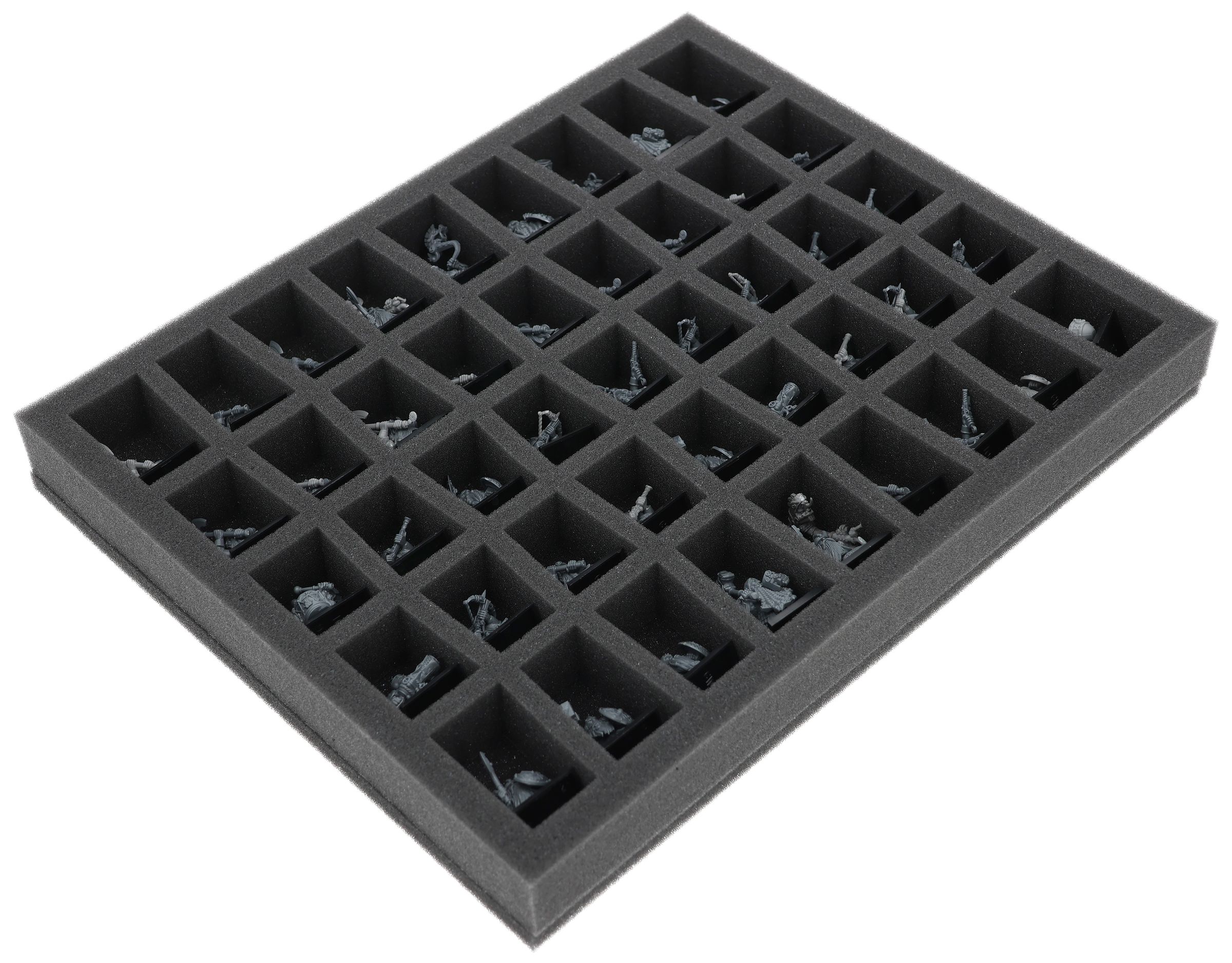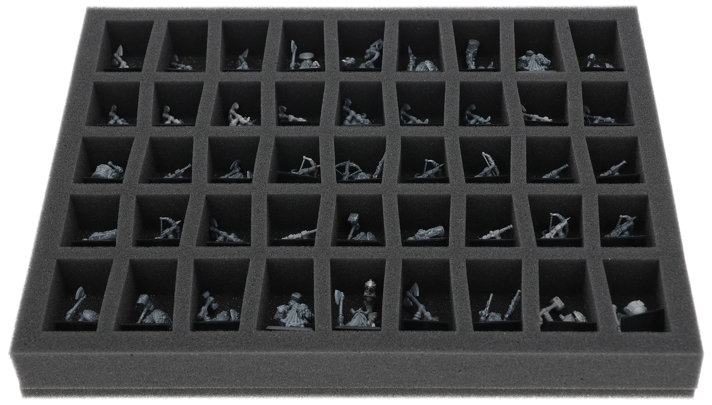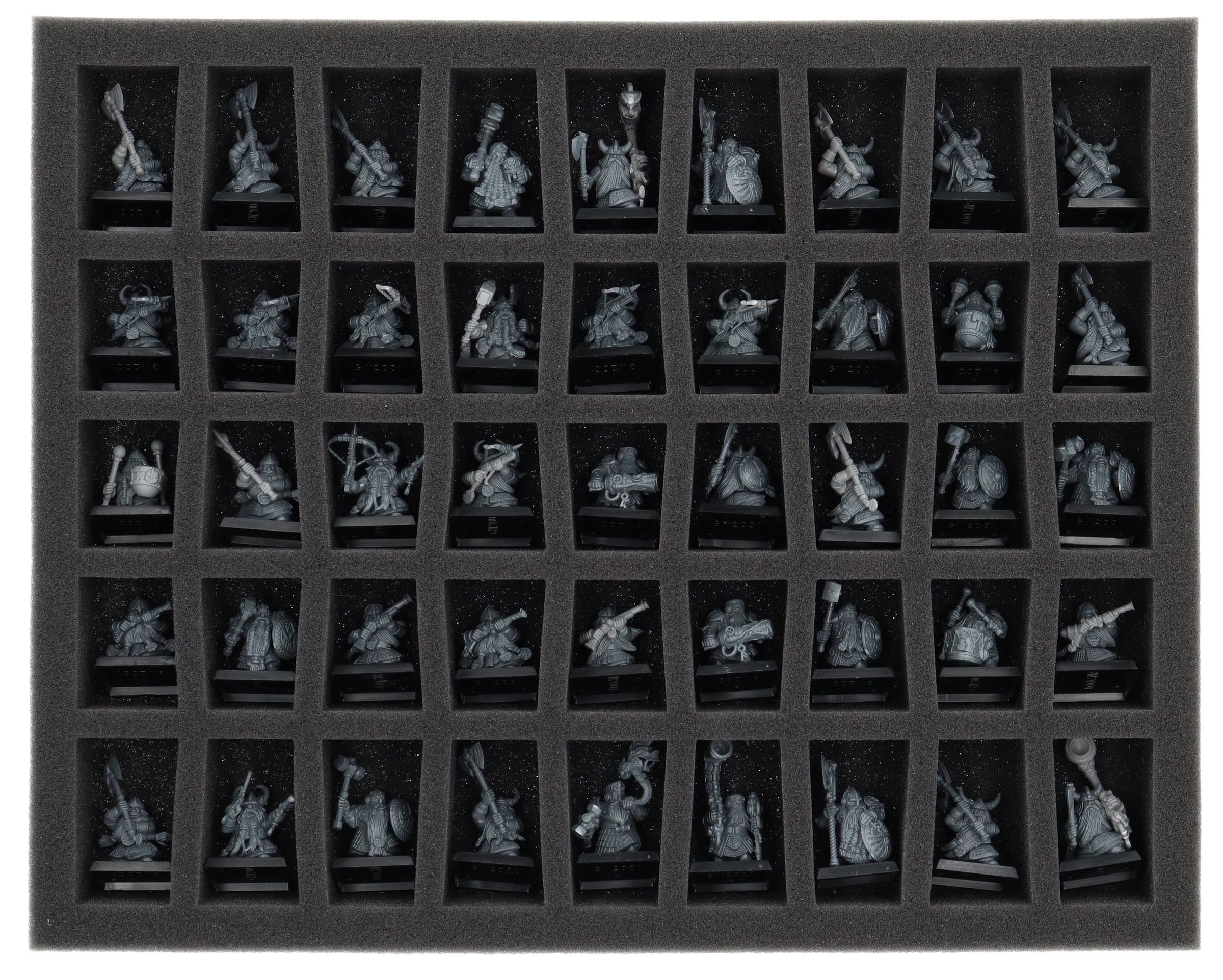 On this Feldherr foam tray you have space for up to 45 miniatures of your army. The insert is especially suitable for storing the Dwarf Warriors, Dwarf Quarrelers, Dwarf Ironbreakers, Dwarf Hammerers, Dwarf Slayers and similar sized models.