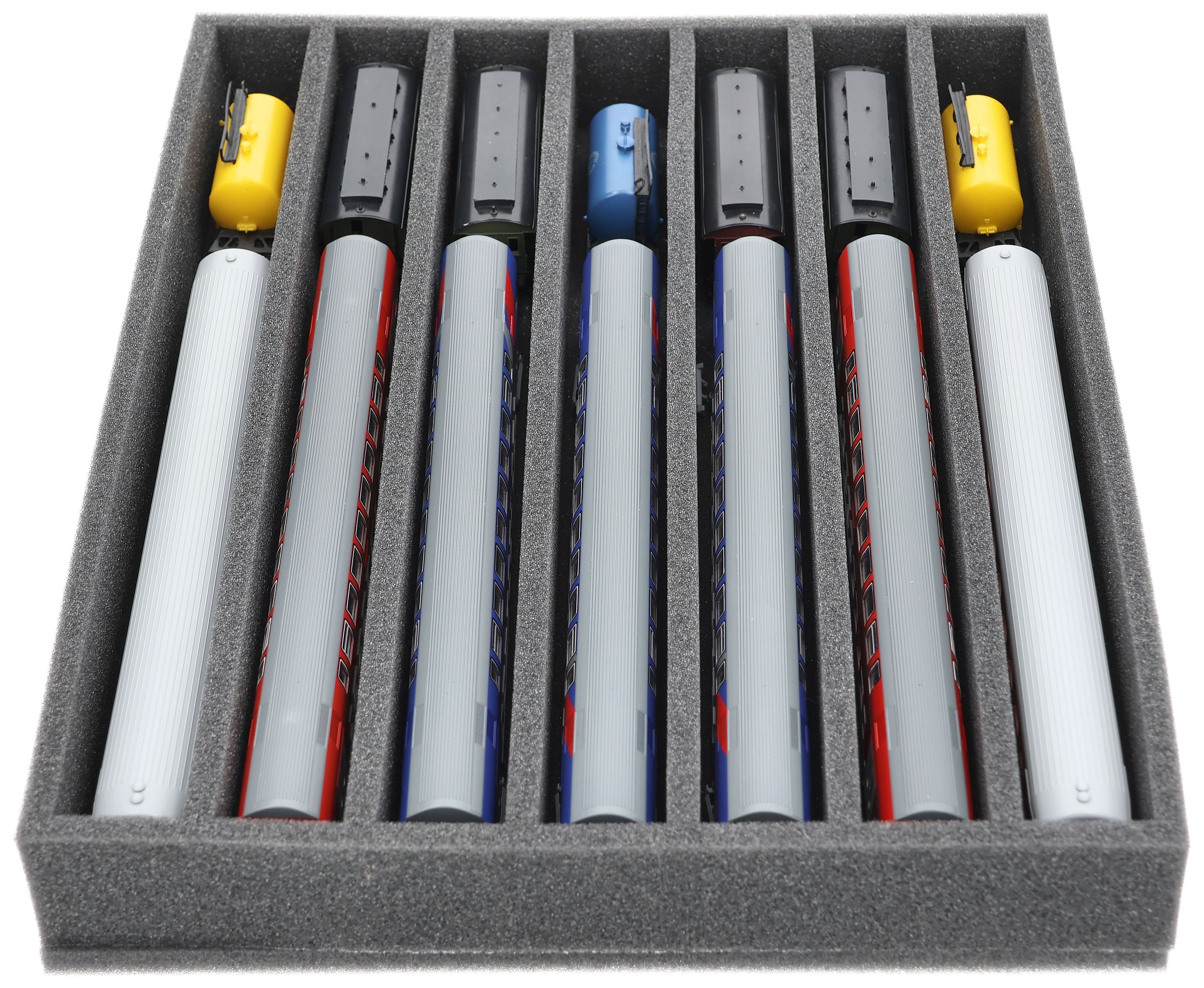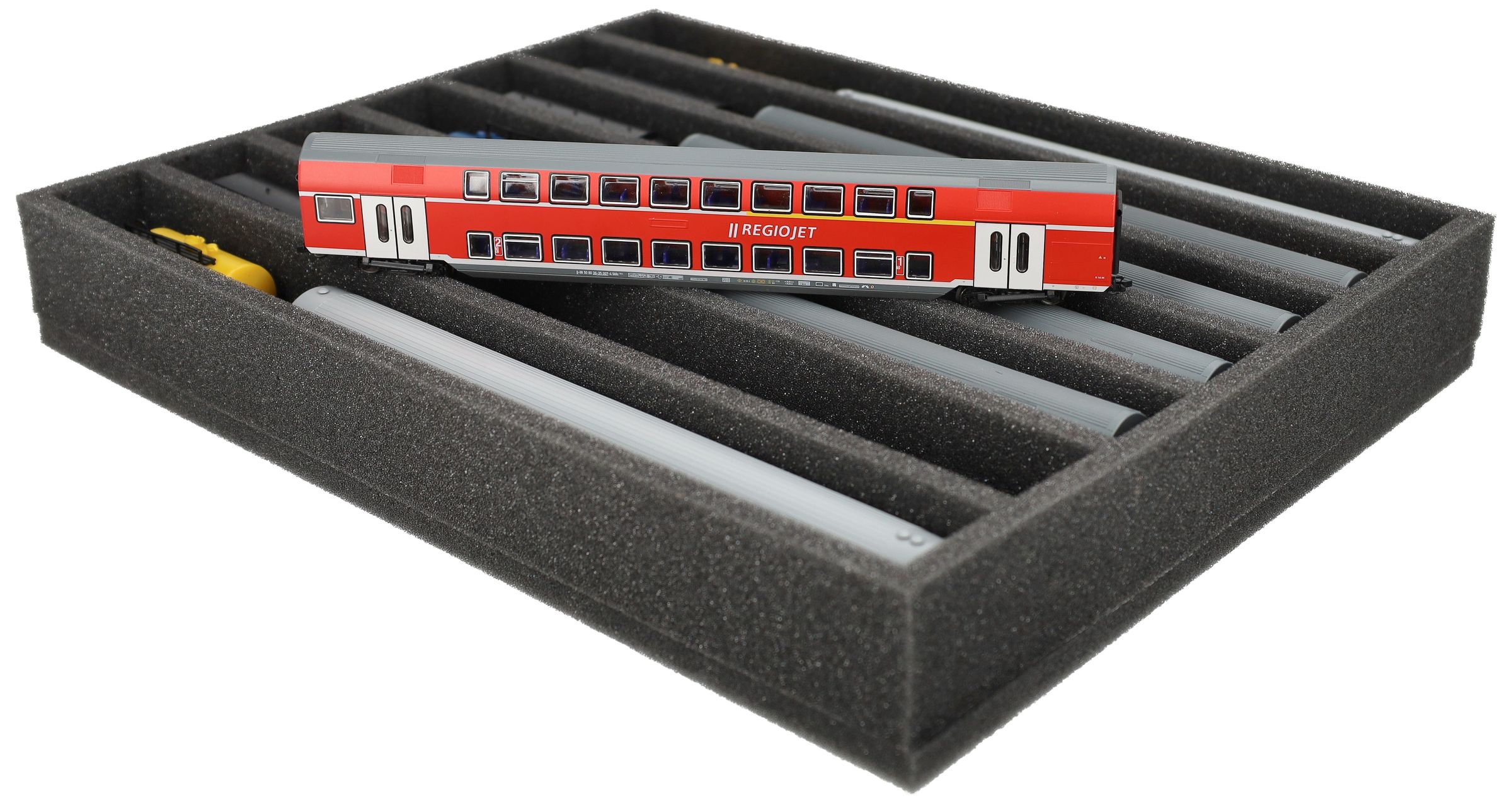 Several trains and carriages can be stored next to each other in one compartment. In order to prevent collision or unintentional coupling, we offer suitable foam spacers (HS040A003) to separate your vehicles.