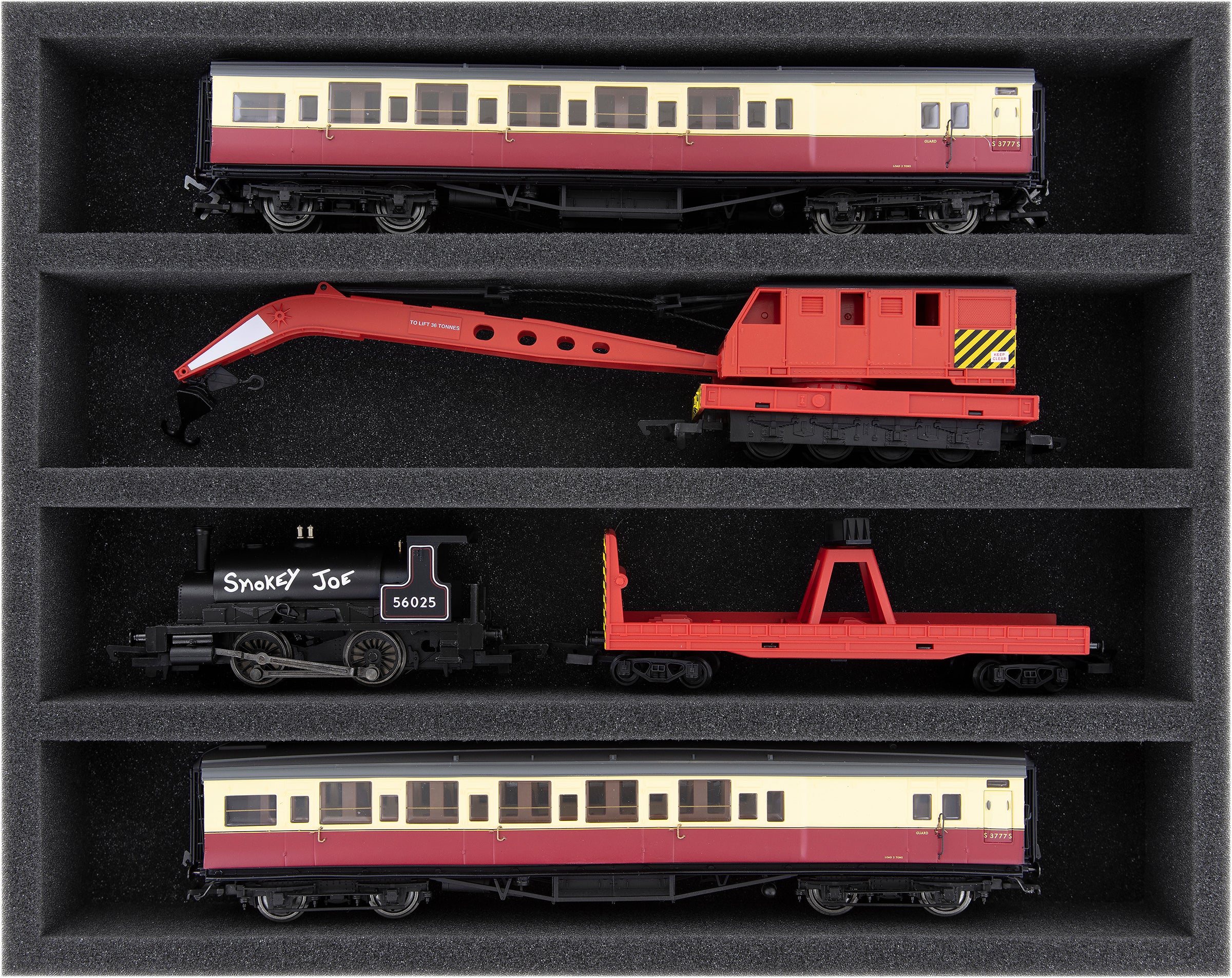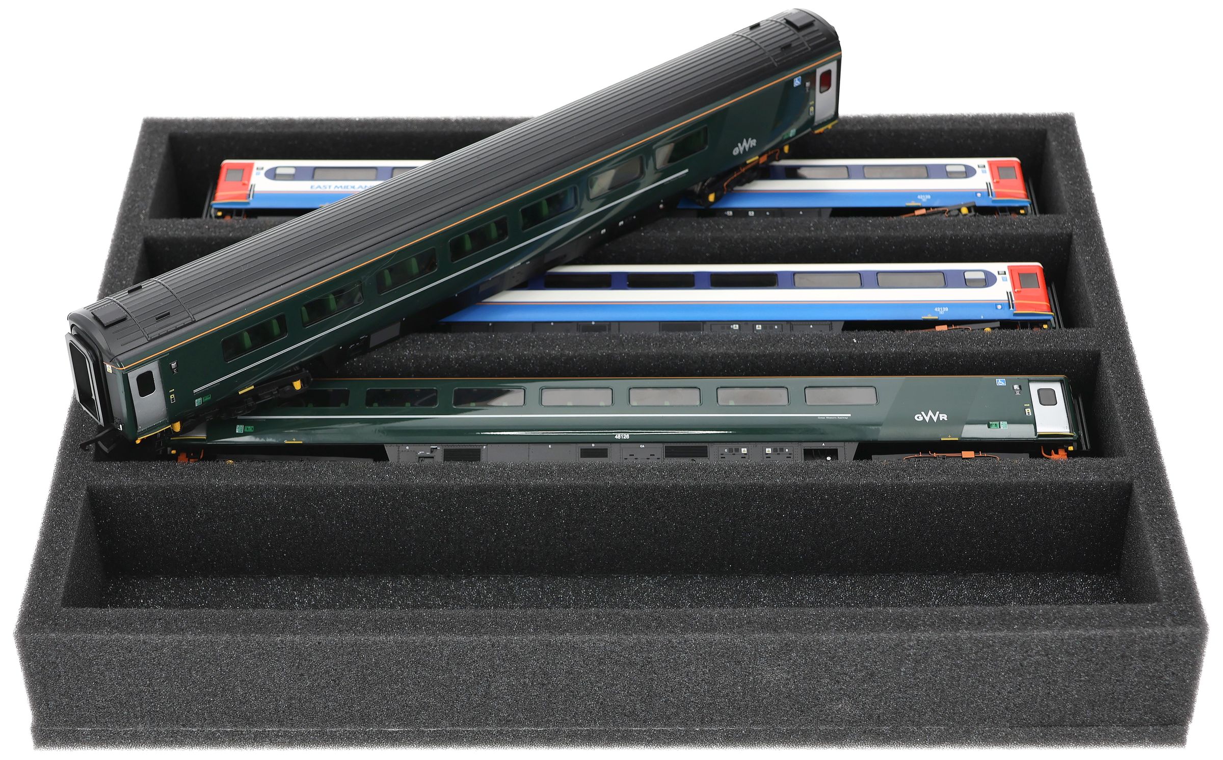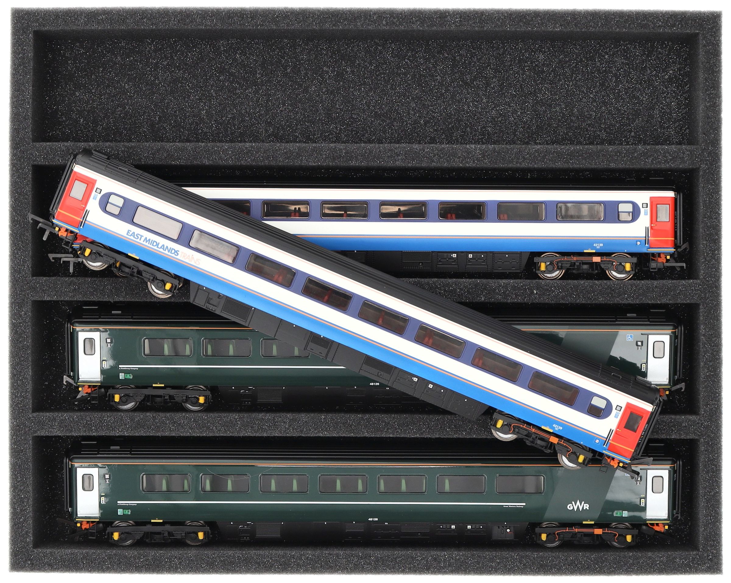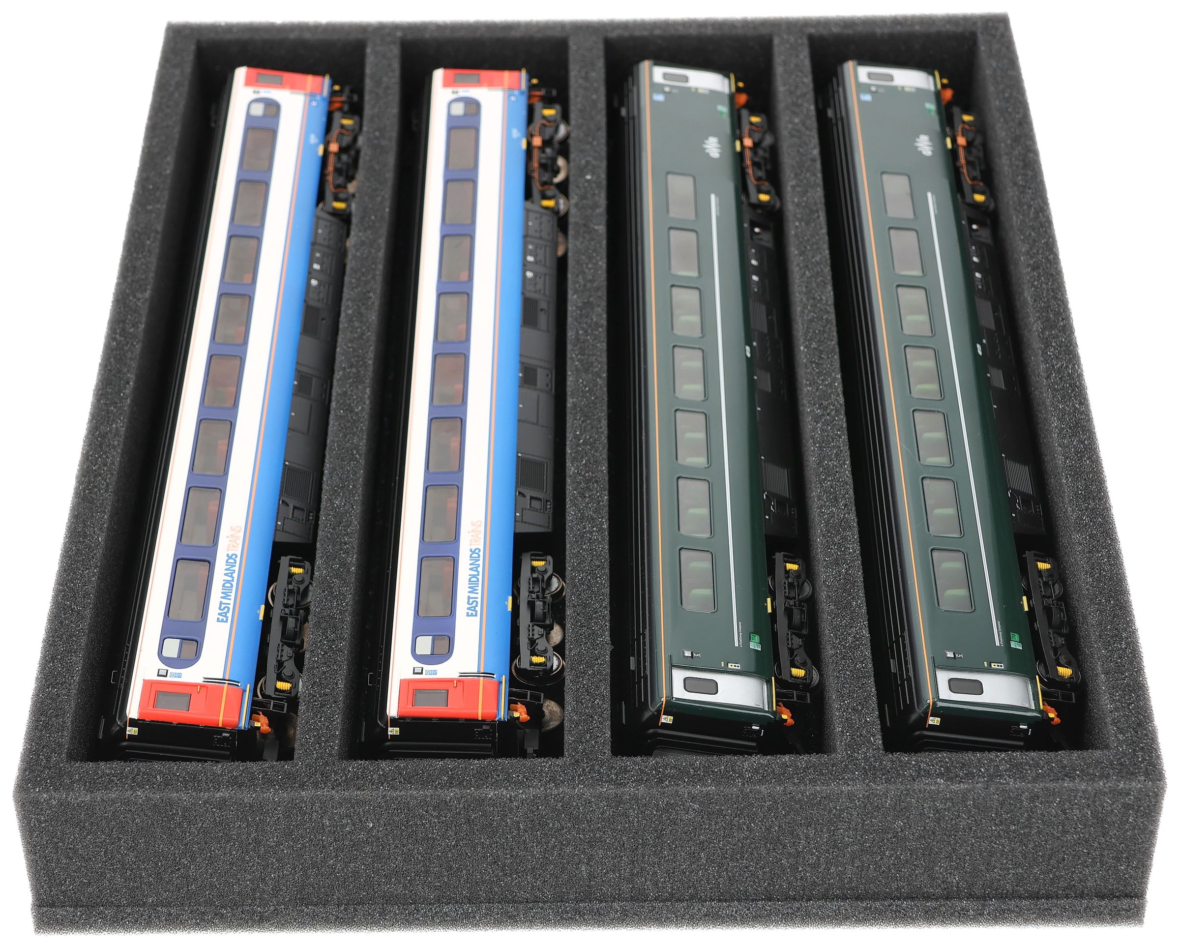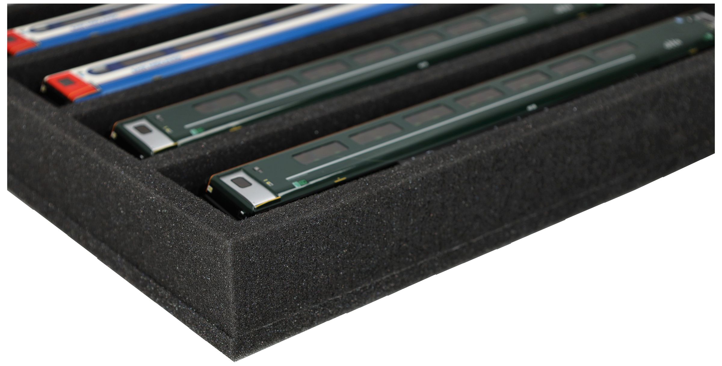 Several trains and carriages can be stored next to each other in one compartment. In order to prevent collision or unintentional coupling, we offer suitable foam spacers (HS040A002) to separate your vehicles.