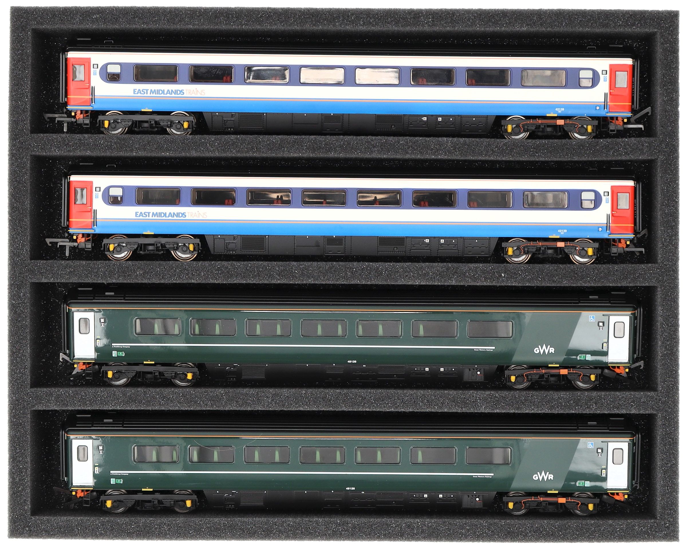Four compartments, tailor-made for horizontal storage of model railways in Gauge 00, offer your wagons and locomotives reliable protection for storage and transport. Due to the lying position the tray can also be used as a display for the presentation of your model train collection.